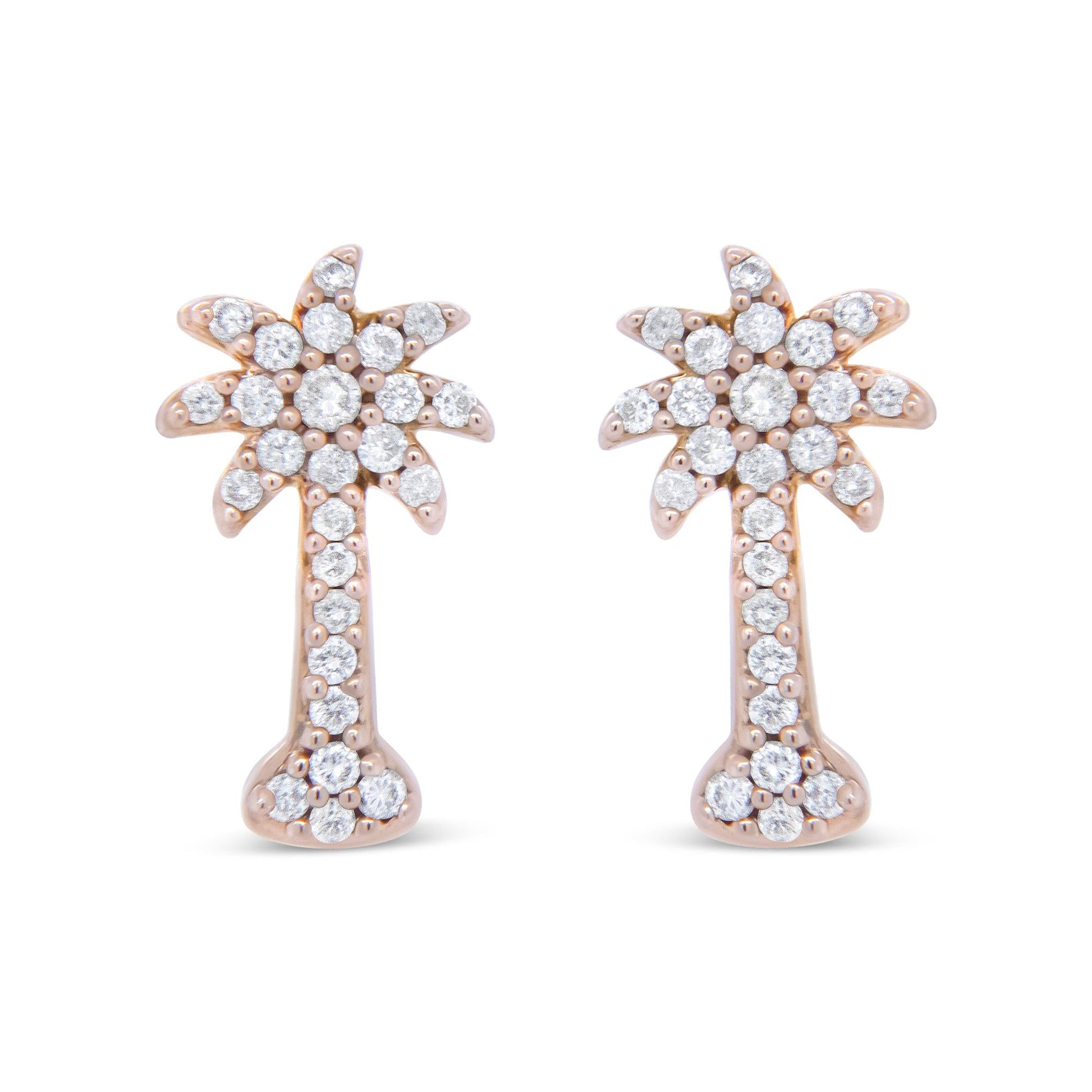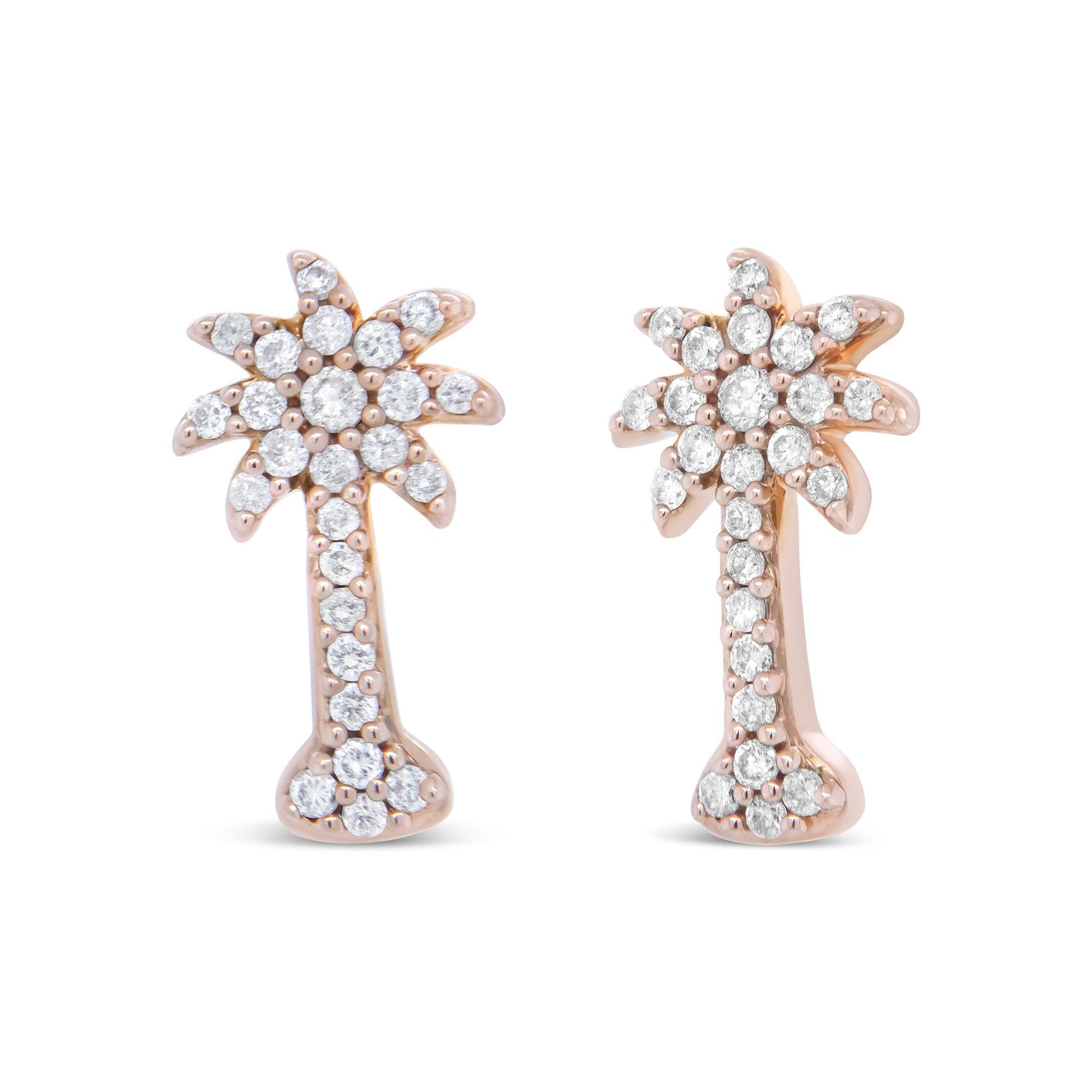 Remind her of the beach with these sparkling and tropical diamond palm tree stud earrings. Crafted in from warm 10k rose gold, each shimmering earring features a gleaming trunk and dazzling shady fronds. Radiant with 1/4ct. t.w. of diamonds and a brilliant buffed luster, these dainty stud earrings secure comfortably with friction backs.