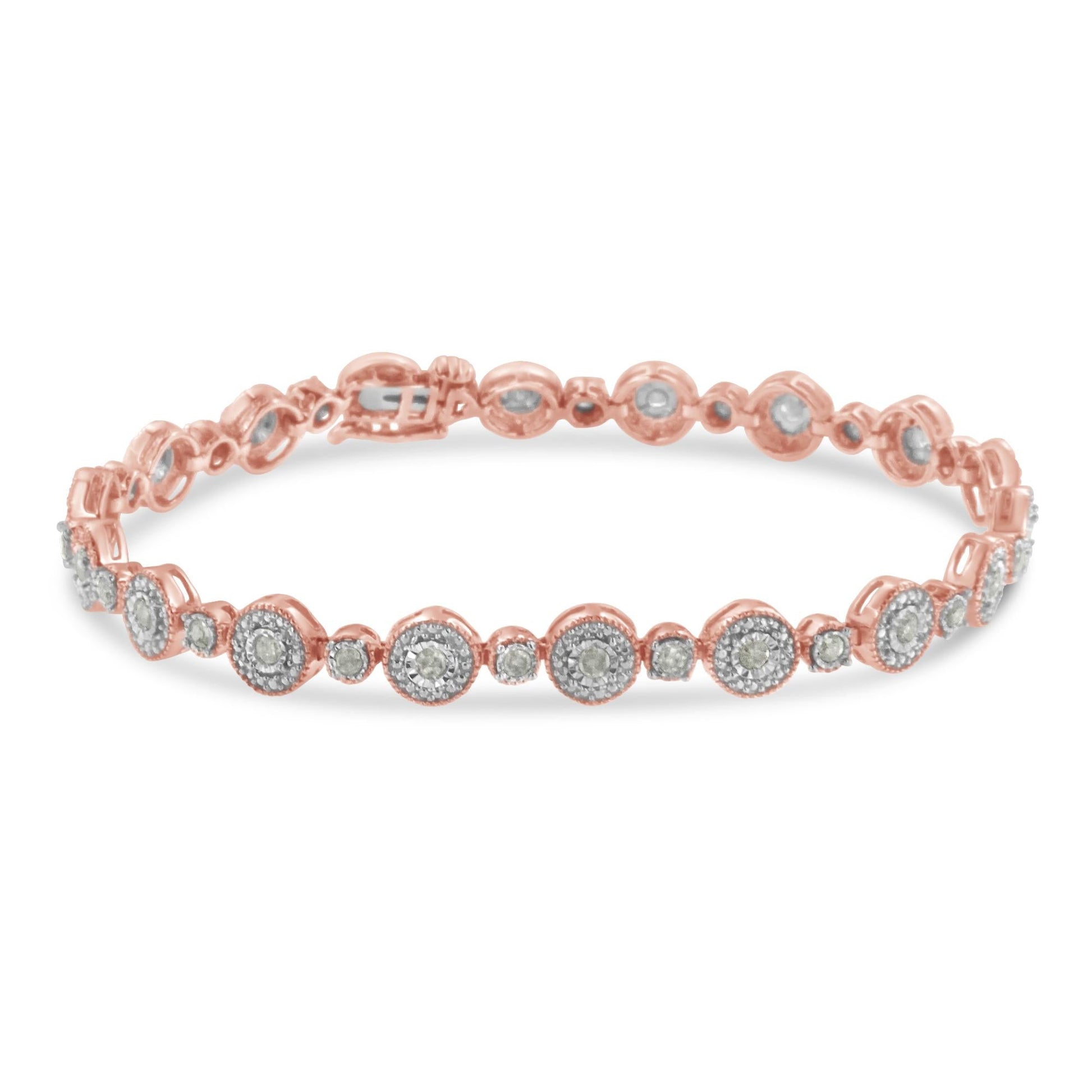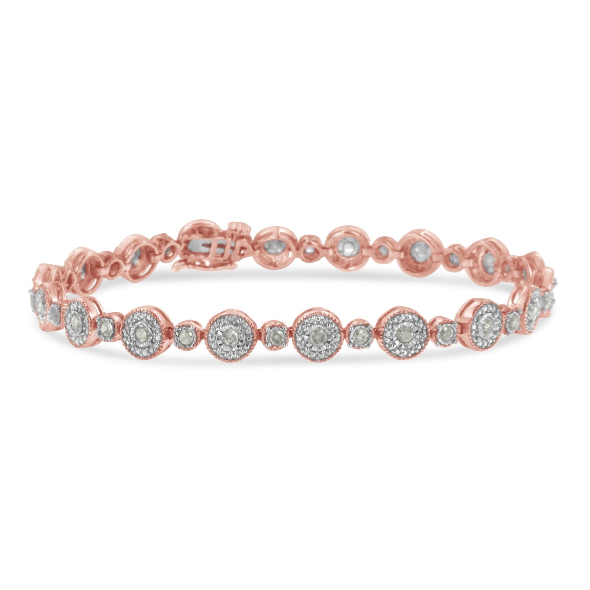 Bring some fascinating twist to your jewelry collection with this rose gold plated sterling silver bracelet. Featuring an elegant design, it is encrusted with round cut 1.33 ct. miracle set diamonds. It exhibits an astounding collective luminescence and comes with box clasp that allows this masterpiece to sit on your wrist gracefully.