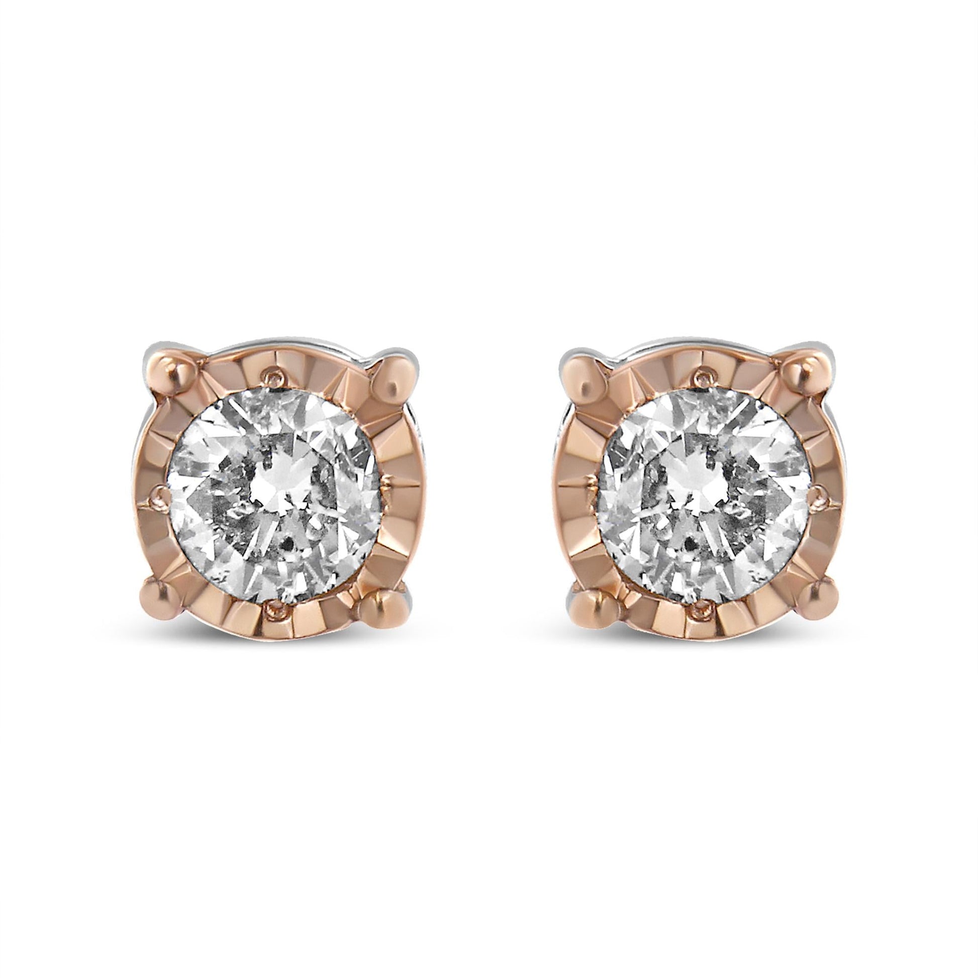 Add a shimmering touch to your wardrobe with these elegant and extravagant diamond earrings. Fashioned in the round shape, the earrings are crafted of your choice of sterling silver flashed with white rhodium, or with 10K rose or yellow gold electroplating. Each of the studs captivates with a miracle plated fluted frame setting, which gives the illusion of a larger diamond and makes them shine like countless stars glitter in the sky. Butterfly push-backs on friction notched posts ensure carefree all-day wear.