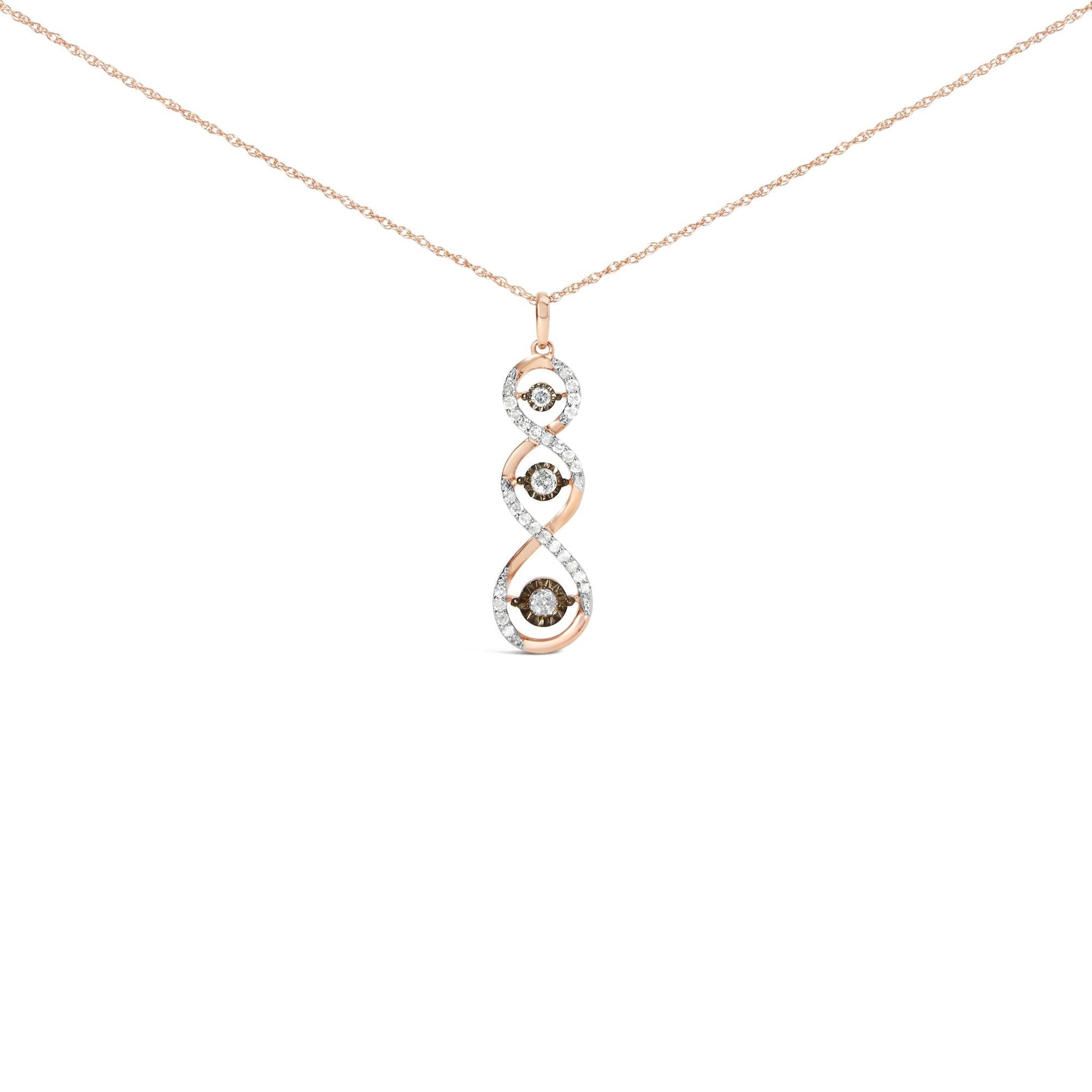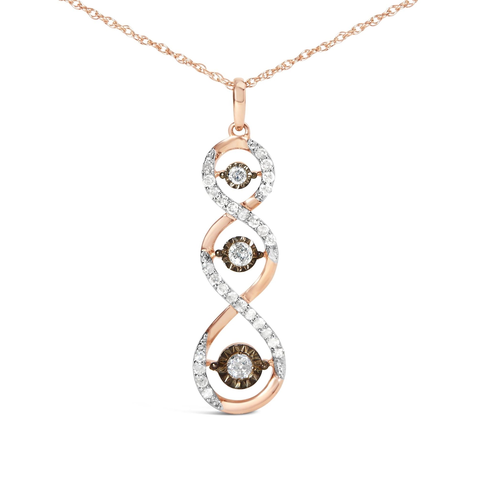 Indulge in the captivating beauty of this stunning pendant necklace, a true masterpiece of artistry and elegance. Crafted from 10K two toned gold plated .925 sterling silver, this necklace boasts a twisted design that will leave you spellbound. Adorned with 30 natural round-cut diamonds, including 3 champagne diamonds and 27 J-K diamonds and I2-I3 clarity, totaling 1/2 cttw, this necklace shimmers with a brilliant sparkle that will light up any room. The diamonds are set in a combination of miracle and prong settings, creating a mesmerizing effect that is simply breathtaking. The rope chain adds the perfect finishing touch to this magnificent necklace, which is secured with a spring ring clasp. Whether you're dressing up for a formal occasion or adding a touch of glamour to your everyday attire, this necklace is the perfect choice.