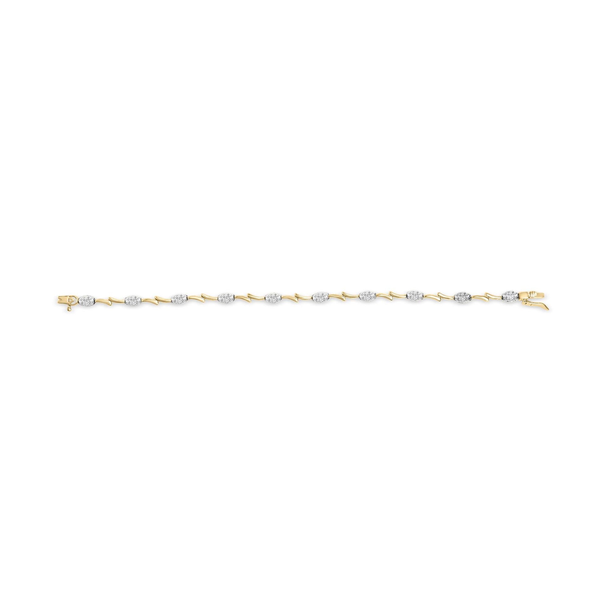 Indulge in the timeless elegance of our 10K White and Yellow Gold Diamond Oval Shaped Cluster Link Bracelet. This exquisite piece is meticulously crafted with 100 natural round diamonds, totaling 1.00 cttw. The diamonds, with their enchanting I-J color and sparkling brilliance, are expertly set in a prong setting to maximize their radiance. The oval-shaped diamond clusters create a stunning visual effect, capturing the light from every angle. The 10K yellow and white gold adds a touch of sophistication, making this bracelet a true statement of luxury. Measuring 7" inches, it effortlessly drapes around your wrist, secured by a box clasp. Designed exclusively for women, this bracelet is perfect for any occasion, whether it's a glamorous evening soiree or a casual lunch date. Elevate your style with this captivating diamond bracelet that exudes glamour and grace.