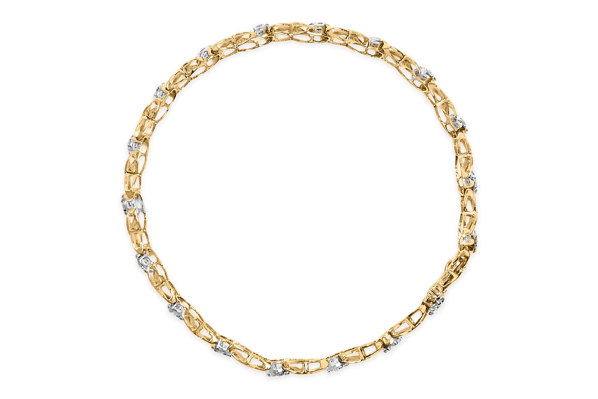 Indulge in the luxury of our stunning diamond bracelet. This exquisite piece features a floral cluster design with an X-Link bracelet, crafted in 10K white gold. Adorned with 144 natural diamonds, totaling 1.00 cttw, this bracelet boasts both round and baguette shaped diamonds. The diamonds are set in a combination of prong and channel settings, showcasing their brilliance and sparkle. With a box clasp, this bracelet is designed to fit comfortably on a woman's wrist. The I-J color and I1-I2 clarity of the diamonds add to the allure of this piece, making it the perfect addition to any jewelry collection. Elevate your style and add a touch of elegance to any outfit with this stunning diamond bracelet.