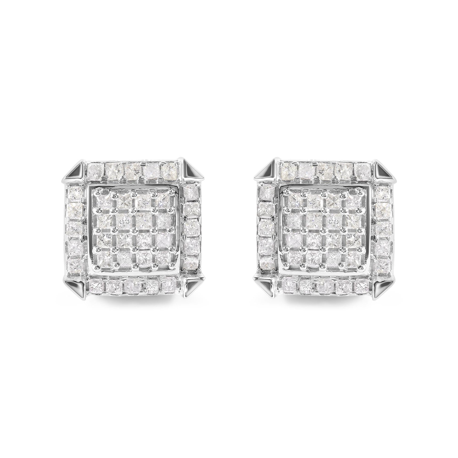 Indulge in the beauty of these stunning diamond composite and halo stud earrings, crafted from the finest 10K white gold. Featuring a total of 72 natural princess-cut diamonds arranged in a breathtaking composite design, these earrings exude elegance and sophistication. The diamonds are carefully prong-set to ensure maximum sparkle and brilliance, while the I-J color and I1-I2 clarity add to their allure. With a total weight of 1 1/10 cttw, these earrings are the perfect statement piece to elevate any outfit. The push-back earring findings ensure a secure and comfortable fit. A must-have for any fashion-forward woman, these diamond stud earrings are sure to make heads turn.