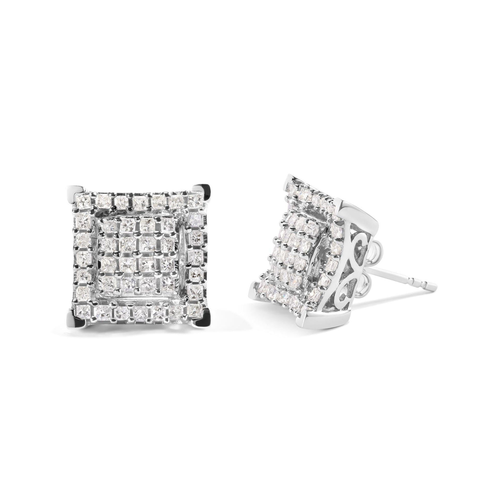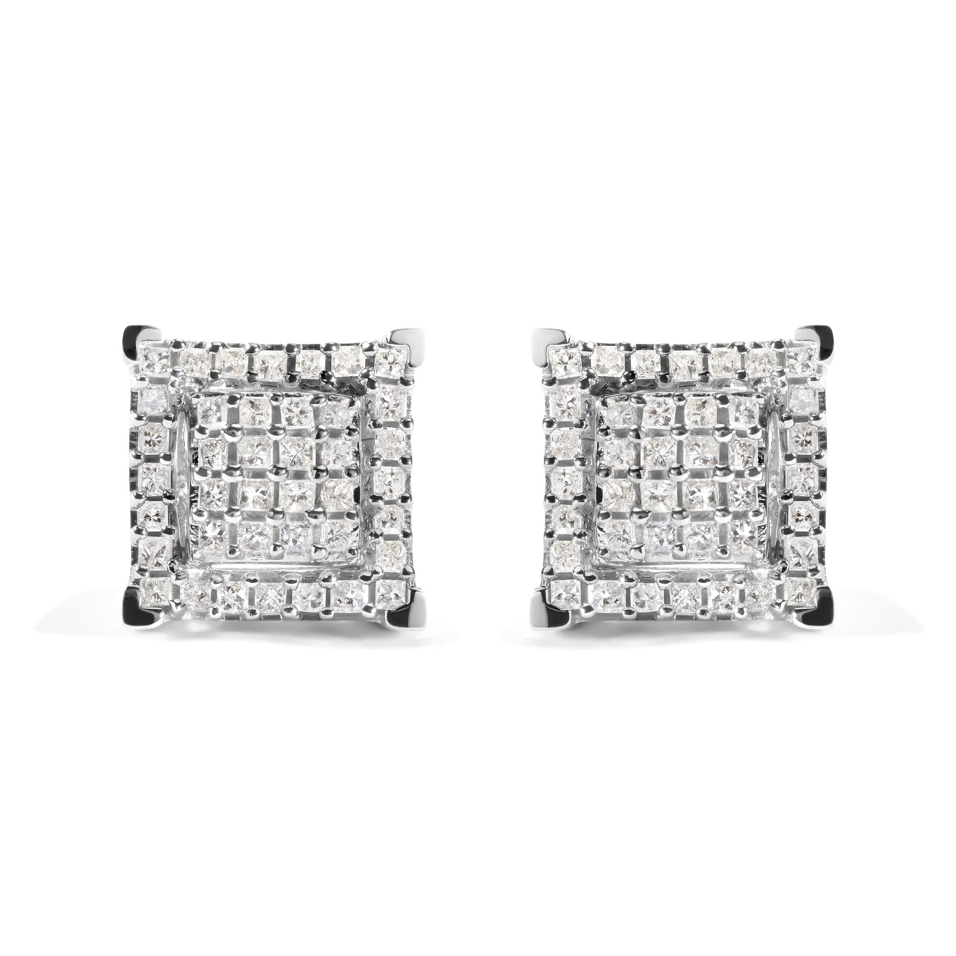 Indulge in the exquisite beauty of these 10K White Gold Princess Diamond Composite Double Square and Halo Stud Earrings. With a total weight of 1 1/4 cttw and 80 dazzling diamonds, these earrings will make a statement wherever you go. The diamond composition creates a unique and stunning design that is sure to catch the eye. The I-J color and I1-I2 clarity of the diamonds add to the overall brilliance of these earrings. Crafted in 10K white gold, these earrings are both durable and elegant. Perfect for any occasion, these diamond stud earrings are a must-have for any jewelry collection. The push back earring findings ensure a secure and comfortable fit. Elevate your jewelry game with these stunning earrings and be the envy of all your friends.