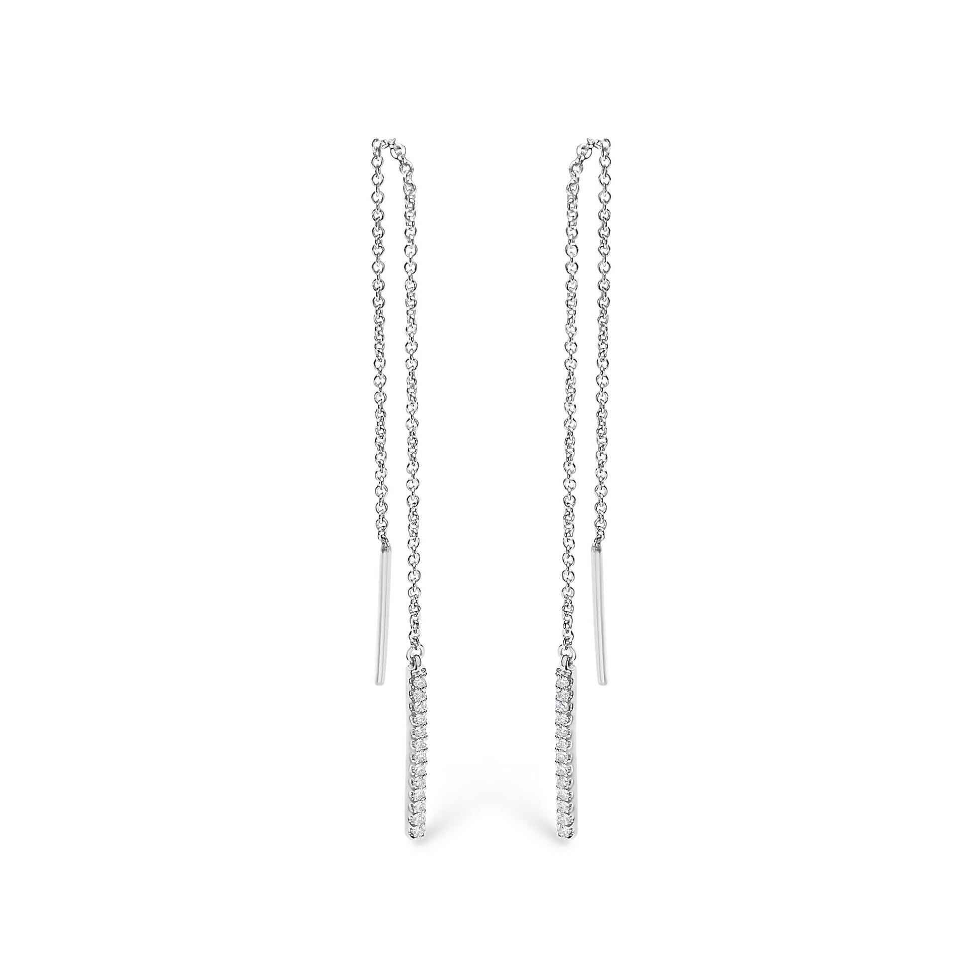 Discover the serene elegance of these 10K white gold threader earrings, where sophistication meets modern design. Each piece invites the light to dance along its rhodium-plated, exquisite elongated chain that smoothly threads through the ear, promising both comfort and a secure fit. Artfully placed along the lower bar, natural diamonds totaling 1/10 carat catch the eye with their gentle shimmer. Graded I-J for color and I1-I2 for clarity, these gems reflect not just light but the depth of your exquisite taste. Perfect for a delicate touch of luxury, these earrings offer a timeless sparkle meant to be cherished and admired in every fleeting moment.