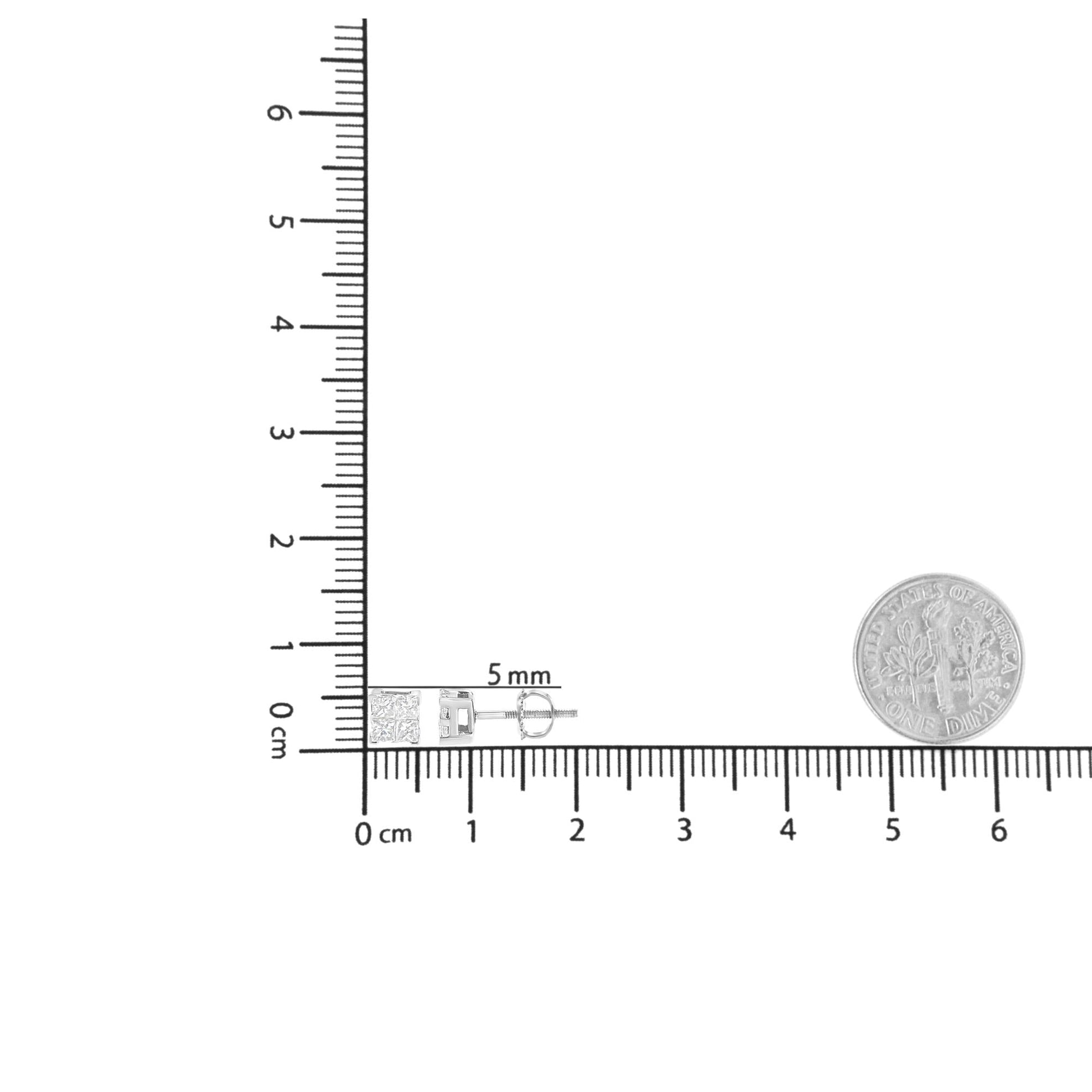 A pair of composite designed quad stud earrings with a cluster of four princess cut diamonds on each stud. These diamonds are invisibly set, creating a larger diamond look. Crafted in 10 karat white gold, they have a total diamond weight of 1/2 carats. These studs come with screwbacks for a secure fit.
