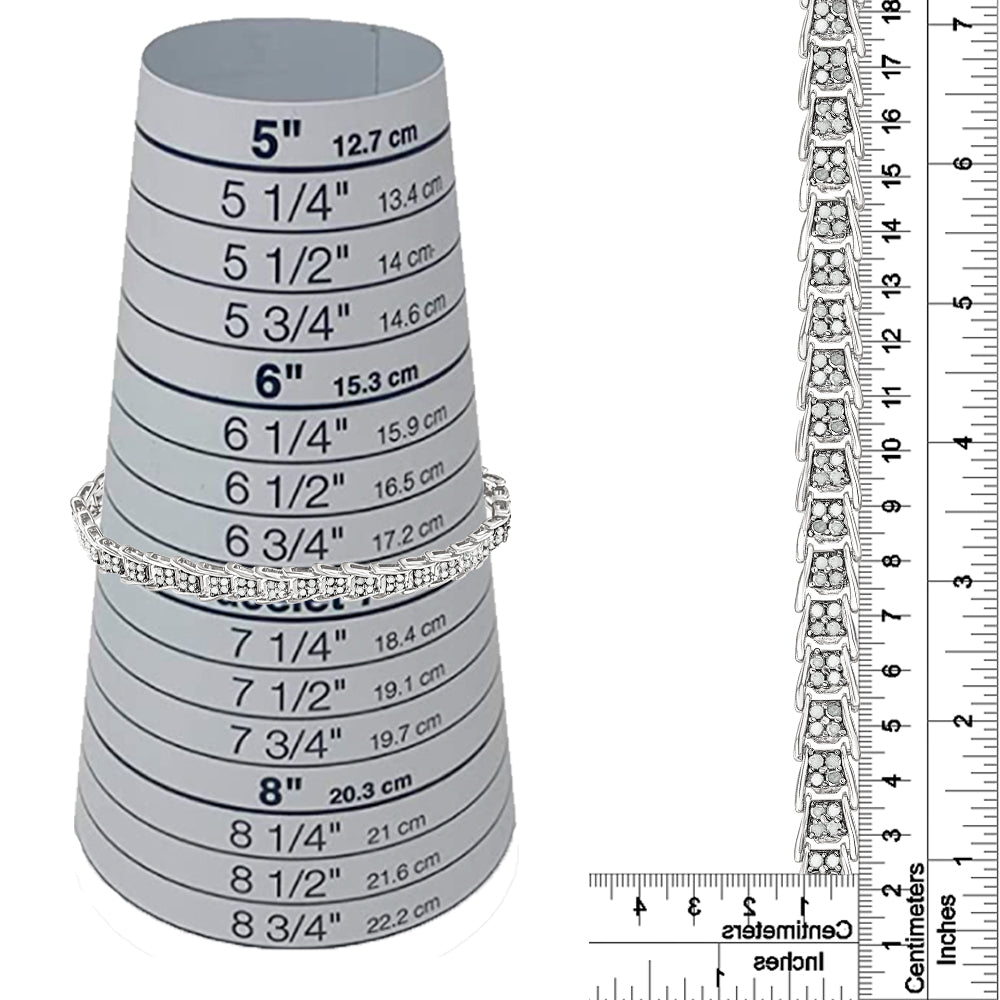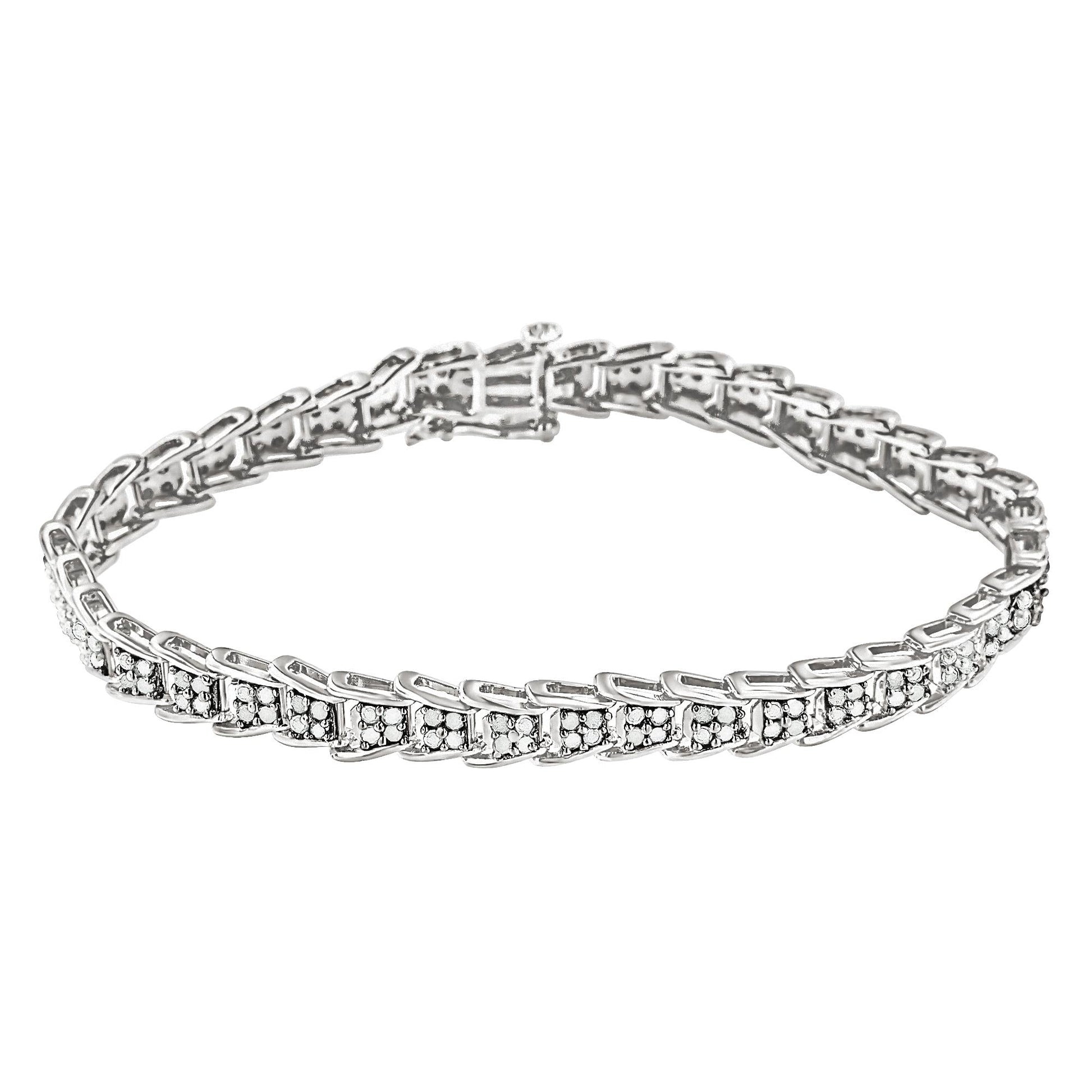 Crafted in 10k white gold, this stunning tennis bracelet features 2ct TDW of glittering round cut diamonds. Each link is inlaid with four prong set diamonds and fans out to fit onto the next one creating a unique effect. A box clasp mechanism keeps it secure.