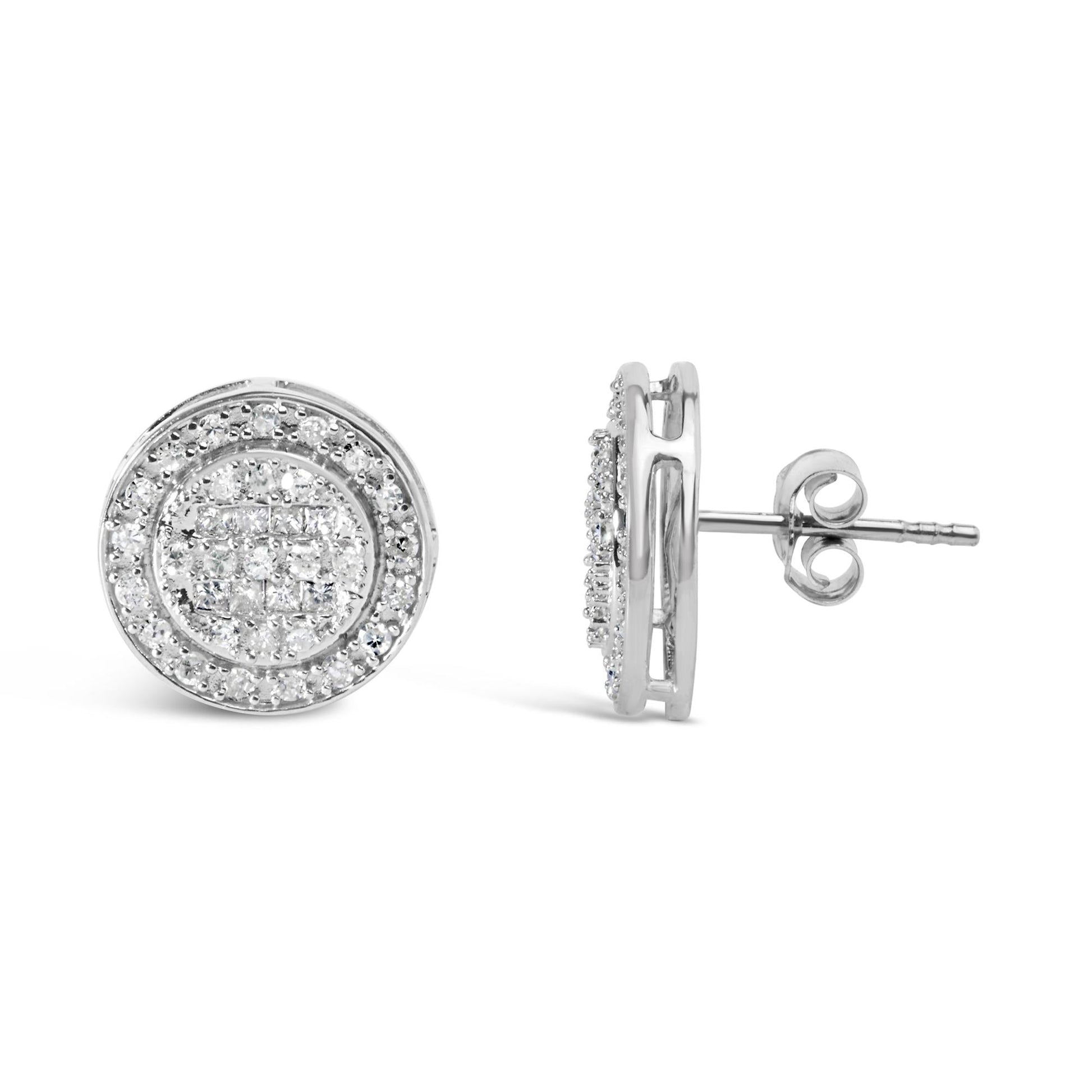 Immerse yourself in the sheer elegance of these 3/4 Cttw diamond earrings, expertly forged in 10K white gold and rhodium plating for an unyielding shine that captivates the spirit. At the heart of each piece, a breathtaking composite of round and princess-cut natural diamonds sparkles intensely, their H-I color and SI1-SI2 clarity radiating with a clear, celestial light. Encircling this brilliant assembly is a delicate halo of smaller diamonds, meticulously arranged to amplify the central shimmer with an ethereal glow. These treasures secure comfortably with a push-back mechanism, blending sublime aesthetics with practicality. Perfect for sophisticated evenings or as a signature of everyday luxury.