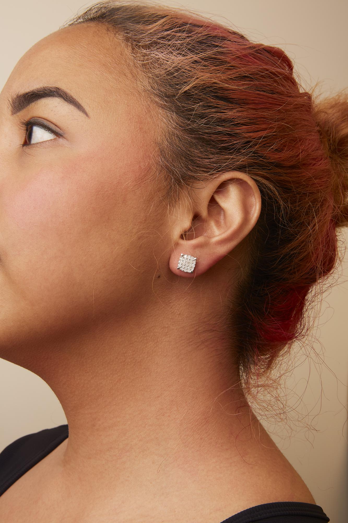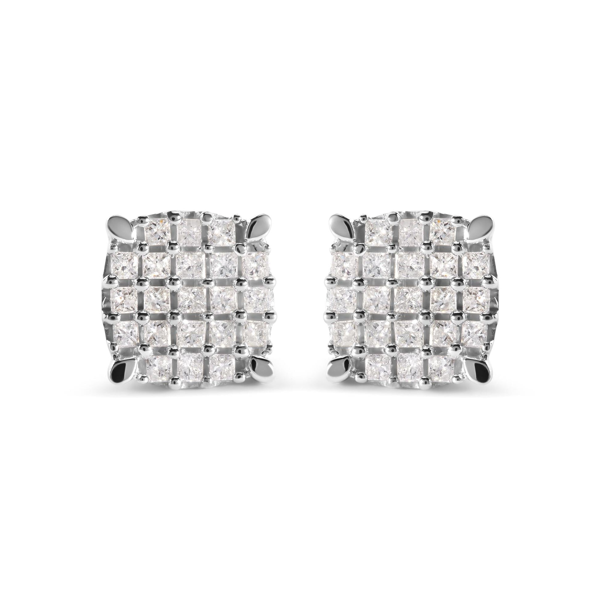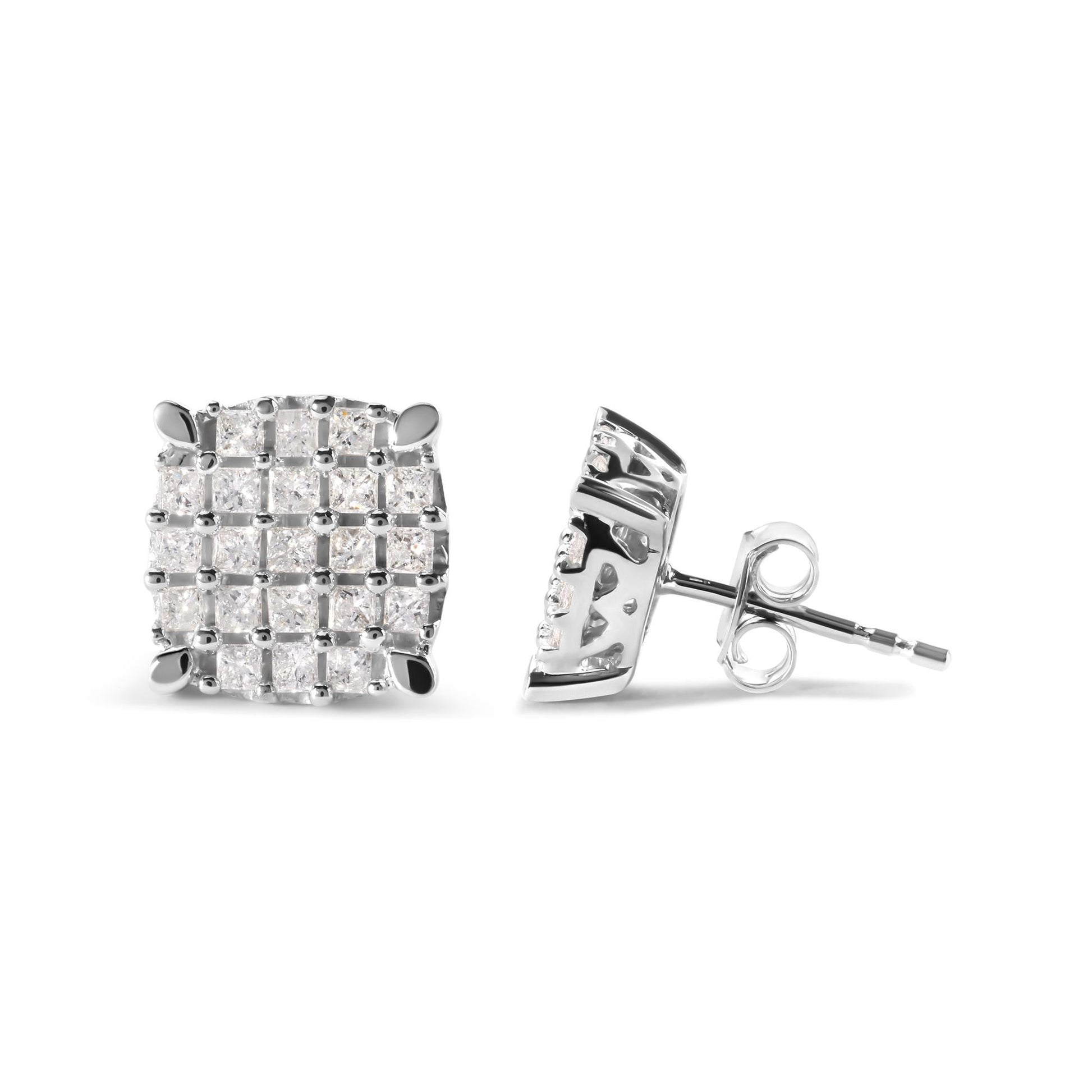 Introducing our stunning 10K white gold stud earrings, a true marvel of craftsmanship and beauty. These earrings feature a unique cushion shape design, adorned with 42 natural princess cut diamonds that sparkle and shine with a total weight of 3/4 cttw. The diamonds are set in a prong setting, ensuring their security and longevity. The I-J color and I1-I2 clarity of the diamonds make for a truly breathtaking display of elegance and class. These earrings are perfect for any occasion, and their push back earring findings make them comfortable and easy to wear. A must-have for any fashion-forward woman who wants to make a statement. Treat yourself or someone special to the gift of luxury with our diamond composite stud earrings.