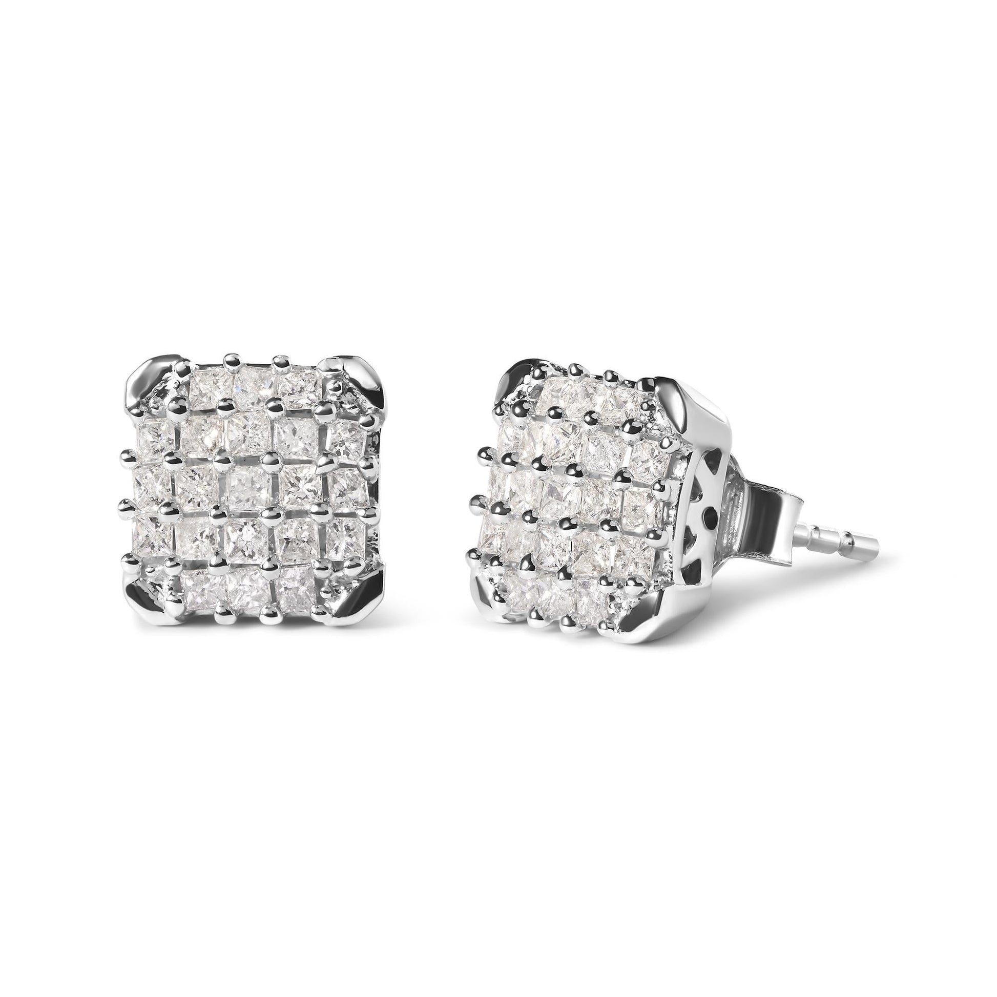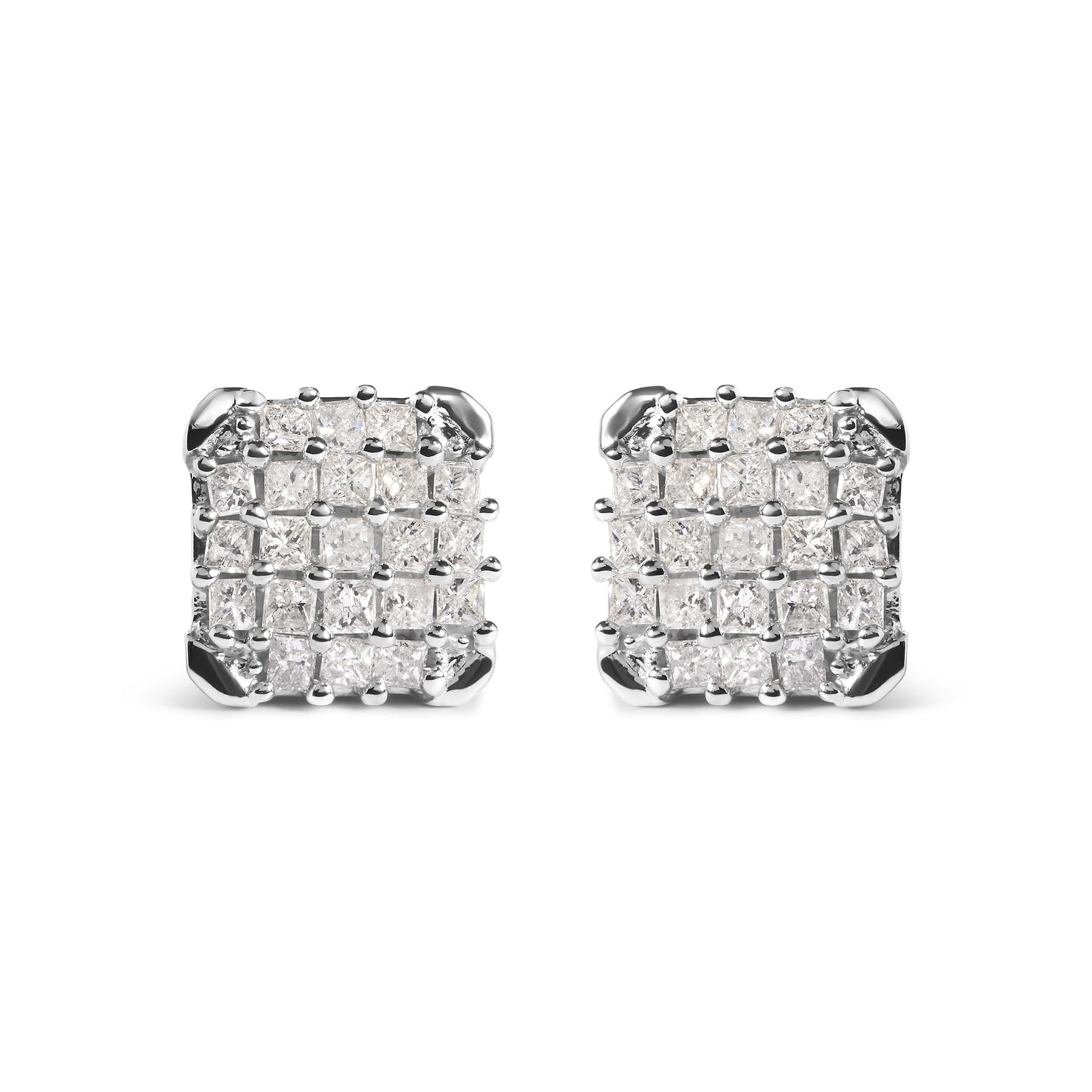 Indulge in the exquisite beauty of these 10K white gold diamond composite stud earrings. Adorned with 42 natural princess diamonds, these earrings boast a total weight of 3/4 cttw. The open frame design adds a touch of elegance, while the prong setting ensures the diamonds shine brilliantly. Featuring push back earring findings, these earrings are perfect for everyday wear or special occasions. With a color grade of I-J and clarity grade of I1-I2, these earrings are sure to make a statement. Treat yourself or someone special to the luxury of these stunning diamond earrings.