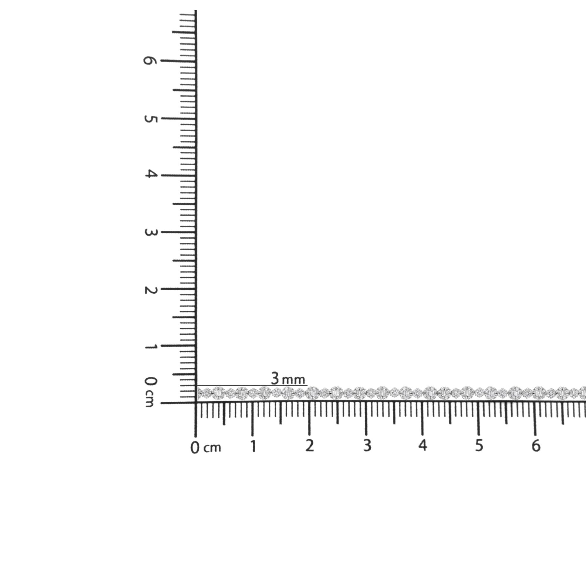 Add a little sparkle to your outfit with this 10k white gold bracelet that features 4ct TDW of diamonds. 306 color treated diamonds dazzle in this link bracelet design. Baguette cut diamonds sit at the heart of a round cut diamond halo and alternate with round cut diamond circular clusters. A box clasp mechanism secures the bracelet.