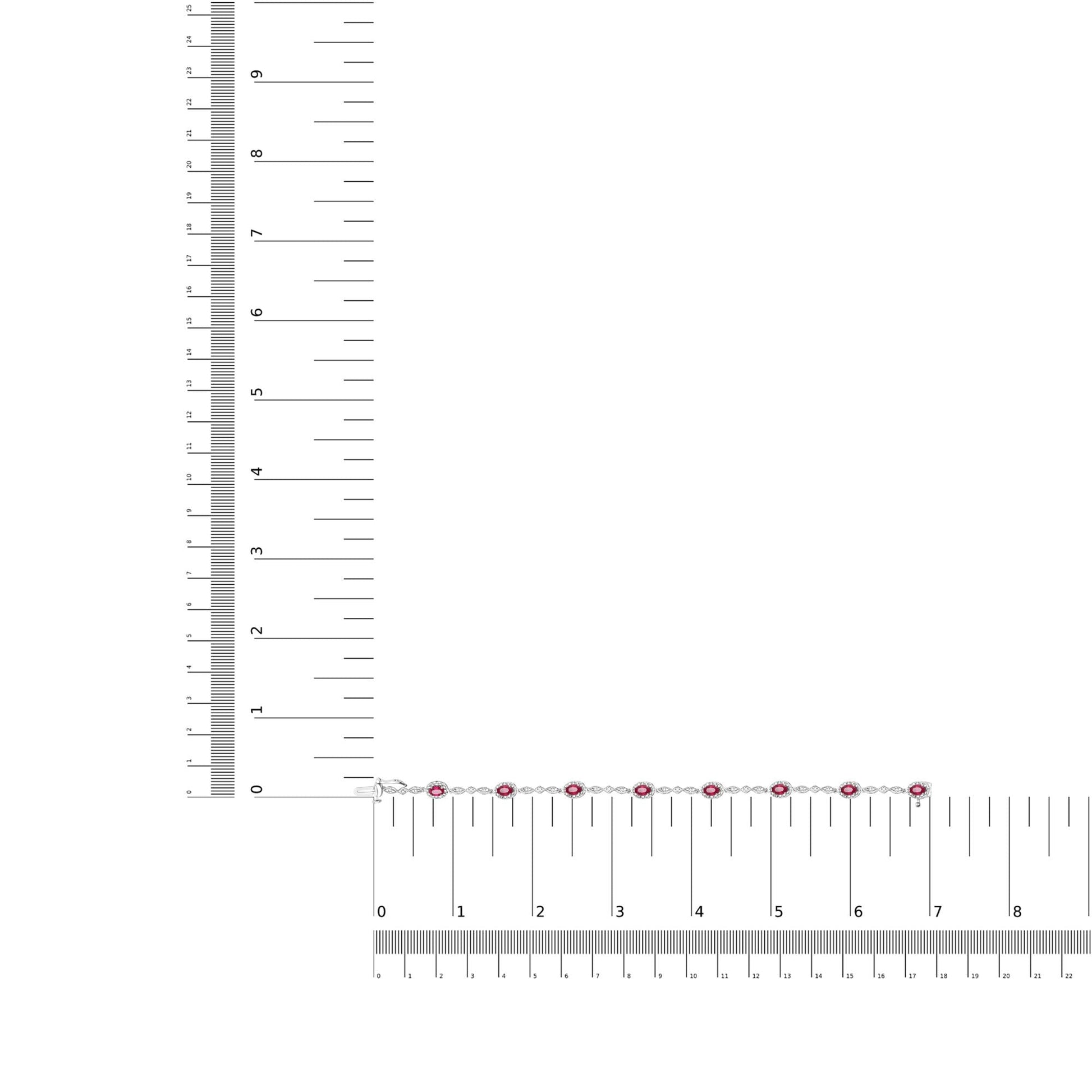 Behold this stunning link bracelet, fit for a queen. Crafted from lustrous 10K white gold, it features eight natural heat treated red rubies, each elegantly cut into an oval shape measuring 4.5mm x 3mm. The rubies are perfectly complemented by eight sparkling round diamonds with a total weight of 0.05 cttw. These diamonds, with their H-I color and SI1-SI2 clarity, are set in prongs to ensure maximum brilliance and fire. This exquisite bracelet measures 7 inches in length and is designed to fit snugly on a woman's wrist. It boasts a unique link design that allows it to drape gracefully around the wrist, creating a luxurious and eye-catching effect. The bracelet is finished with a secure box clasp, ensuring that it stays firmly in place. This ruby and diamond link bracelet is the perfect choice for anyone seeking to add a touch of elegance and sophistication to their jewelry collection. Whether worn alone or paired with other pieces, it is sure to turn heads and draw compliments.