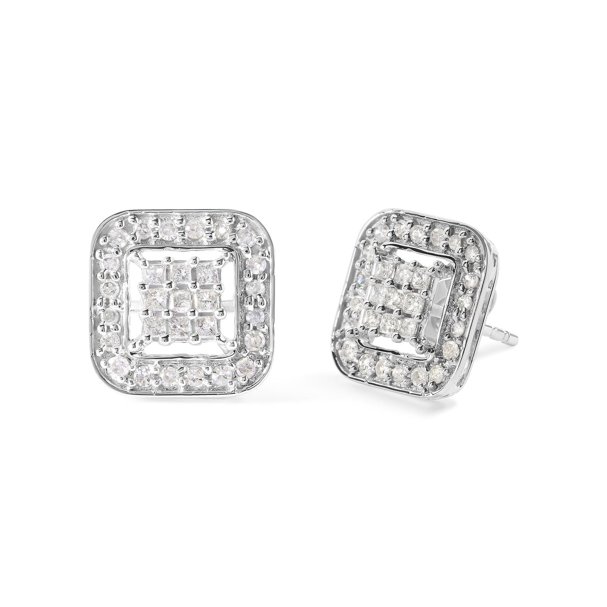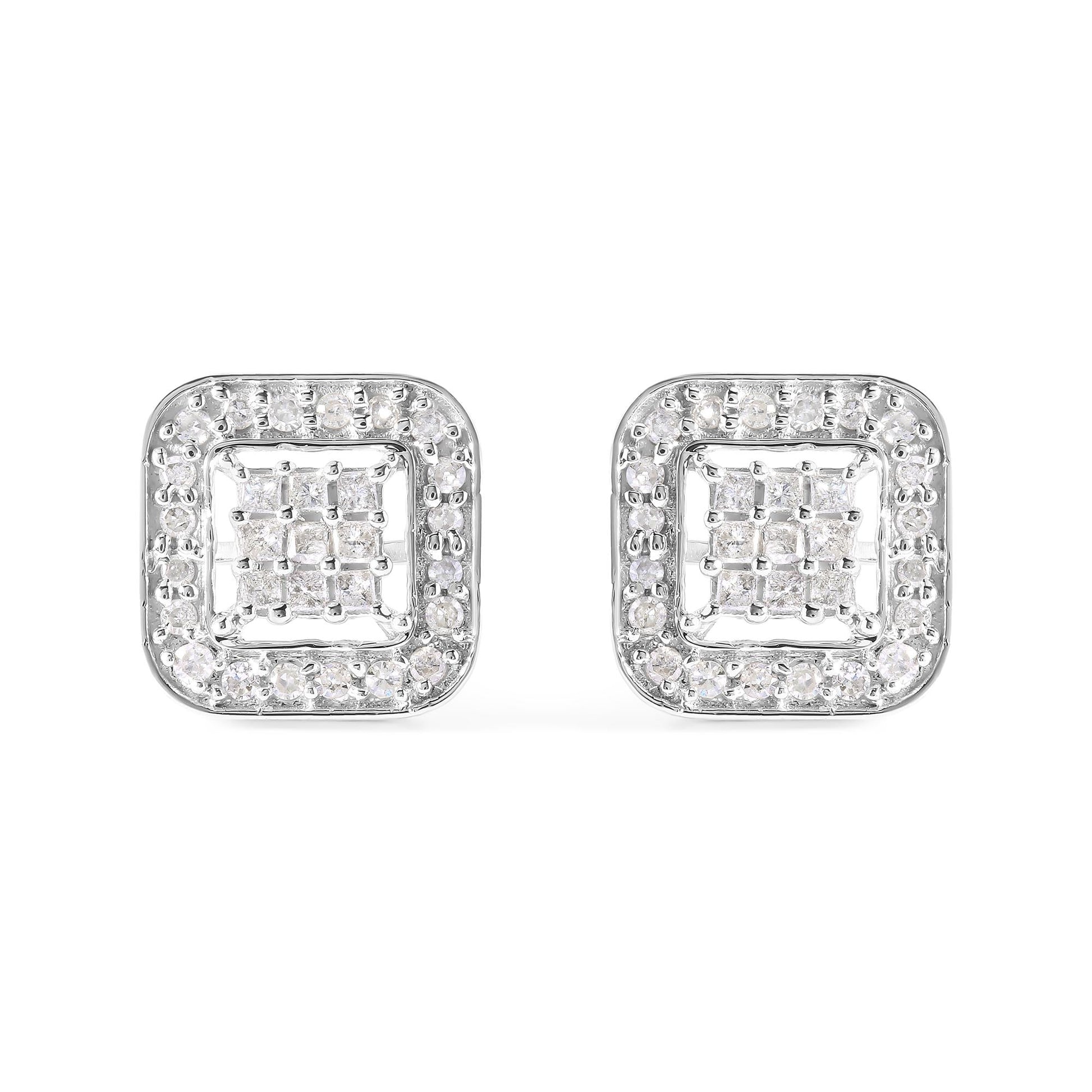 Immerse yourself in the splendor of sophistication with these exquisite earrings, masterfully crafted from lustrous 10K white gold that's rhodium-plated for an extra touch of shine. The centerpiece of each earring is a mesmerizing square composite of nine princess-cut diamonds, brilliantly arranged to captivate the light. Encircling this sparkling array is a halo of delicate round diamonds, collectively weighing 5/8 carats. The harmonious balance of I-J color and I1-I2 clarity in these natural gems enhances their allure, making each glance a statement of elegance. Designed for both comfort and security, the push-back closure ensures that these treasured earrings remain a part of your ensemble, perfect for every memorable occasion.