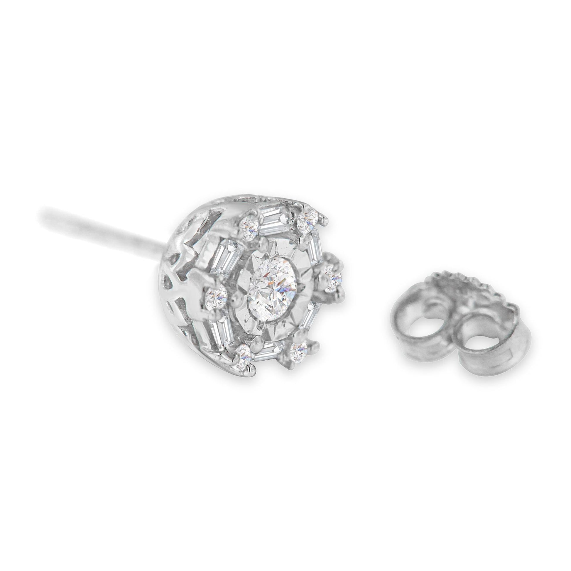 Classy stud earrings made with 10k white gold and featuring round-cut diamonds in an invisible setting as the main stone. This elegant piece also displays round-cut diamonds with an invisible setting and baguette-cut diamonds in a channel setting . They include 26 genuine diamonds and present a 1/2ct total diamond weight. These earrings come with push backs and free gift pack aging. Excellent choice for formal events and special occasions.
