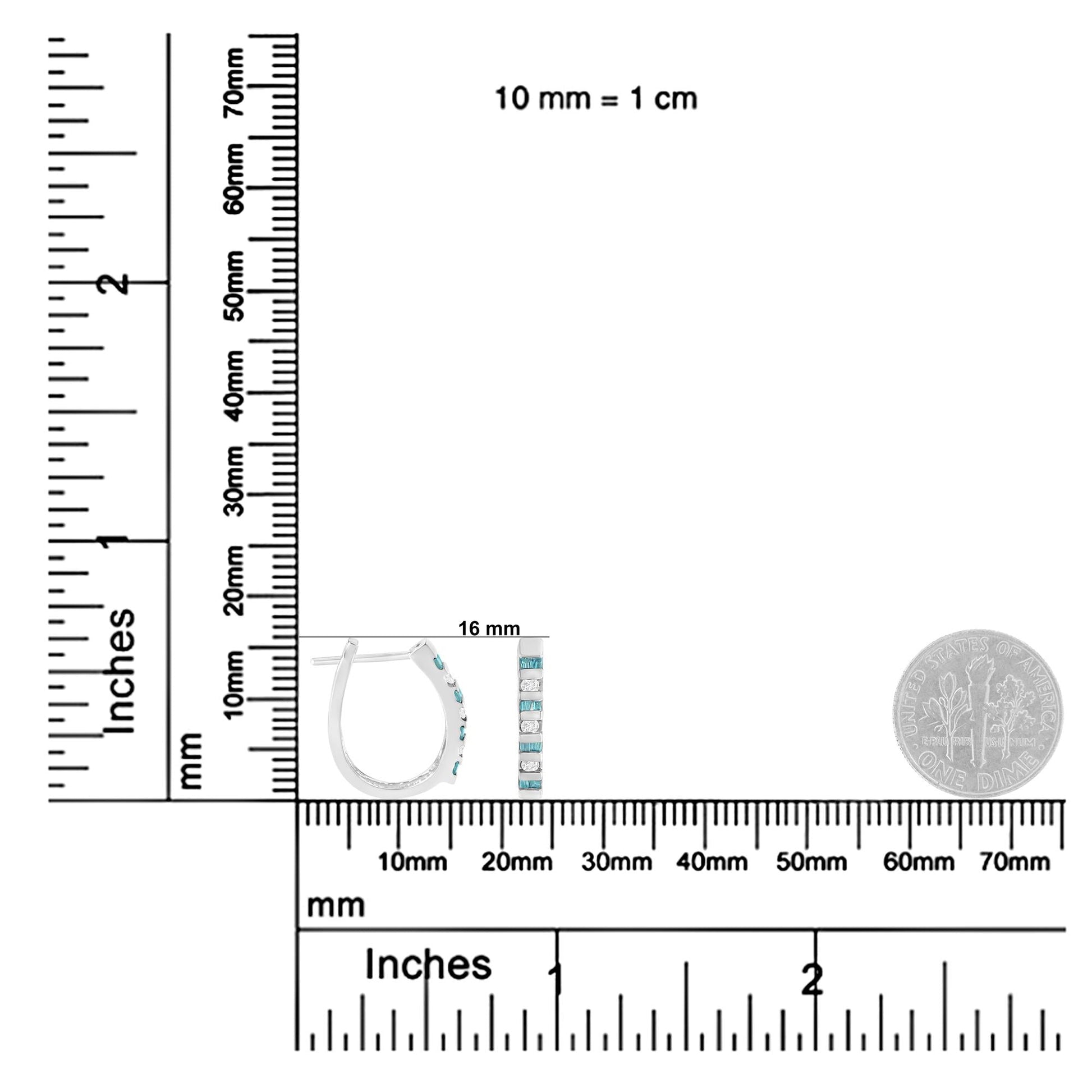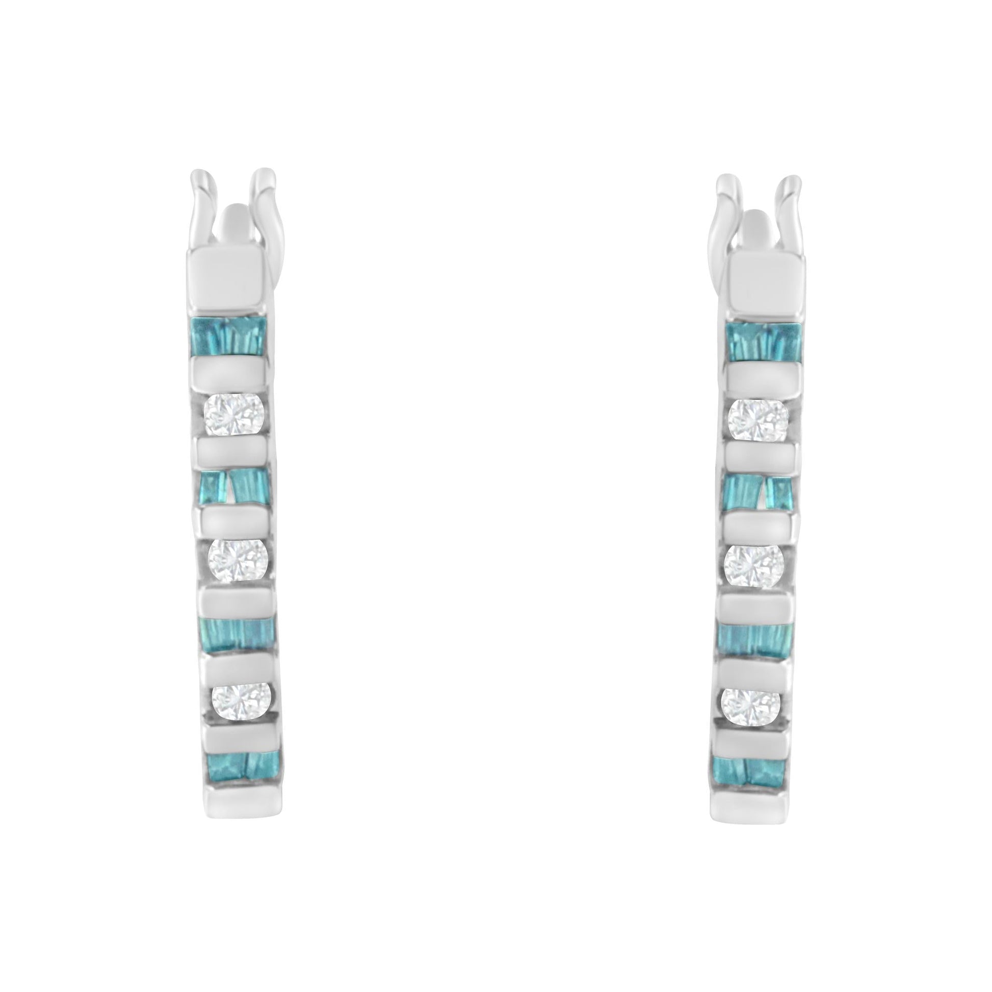 Dazzle with these 10-karat diamond hoop earrings! This pair features brilliantly polished round cut white diamond, and baguette cut treated blue diamond encased in white gold and artfully arranged in a channel setting, thus making the whole of the pair look ravishing.