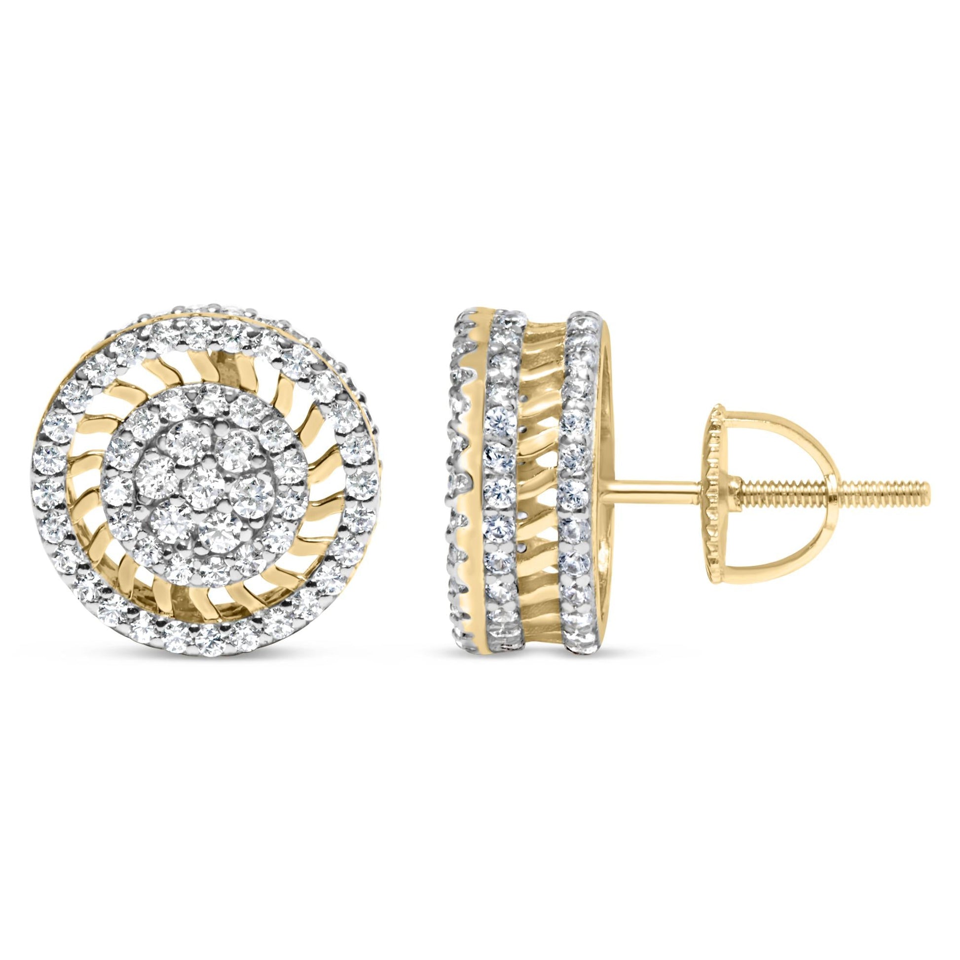 Bathe in the golden radiance of these exquisite earrings, each one a testament to the dazzling elegance of a sunburst captured in timeless beauty. Meticulously crafted from lustrous 10K yellow gold, these radiant studs ignite any ensemble with their halo arrangement, amplifying your inner light. The natural diamonds, totaling 1.00 carat, are carefully selected for their I-J color grade and I2-I3 clarity, guaranteeing every gem sparkles with a unique charm and character. Intricately set in prongs that are rhodium-plated white, the diamonds' brilliance is magnified, ensuring they gleam with heavenly brightness. Whether you're gracing a gala, elevating a business meeting, or simply indulging in everyday luxury, these earrings promise to be your perfect companion. The screw-back closures offer peace of mind, combining security with style. Embrace these studded wonders and let your elegance shine through with every graceful turn of your head.