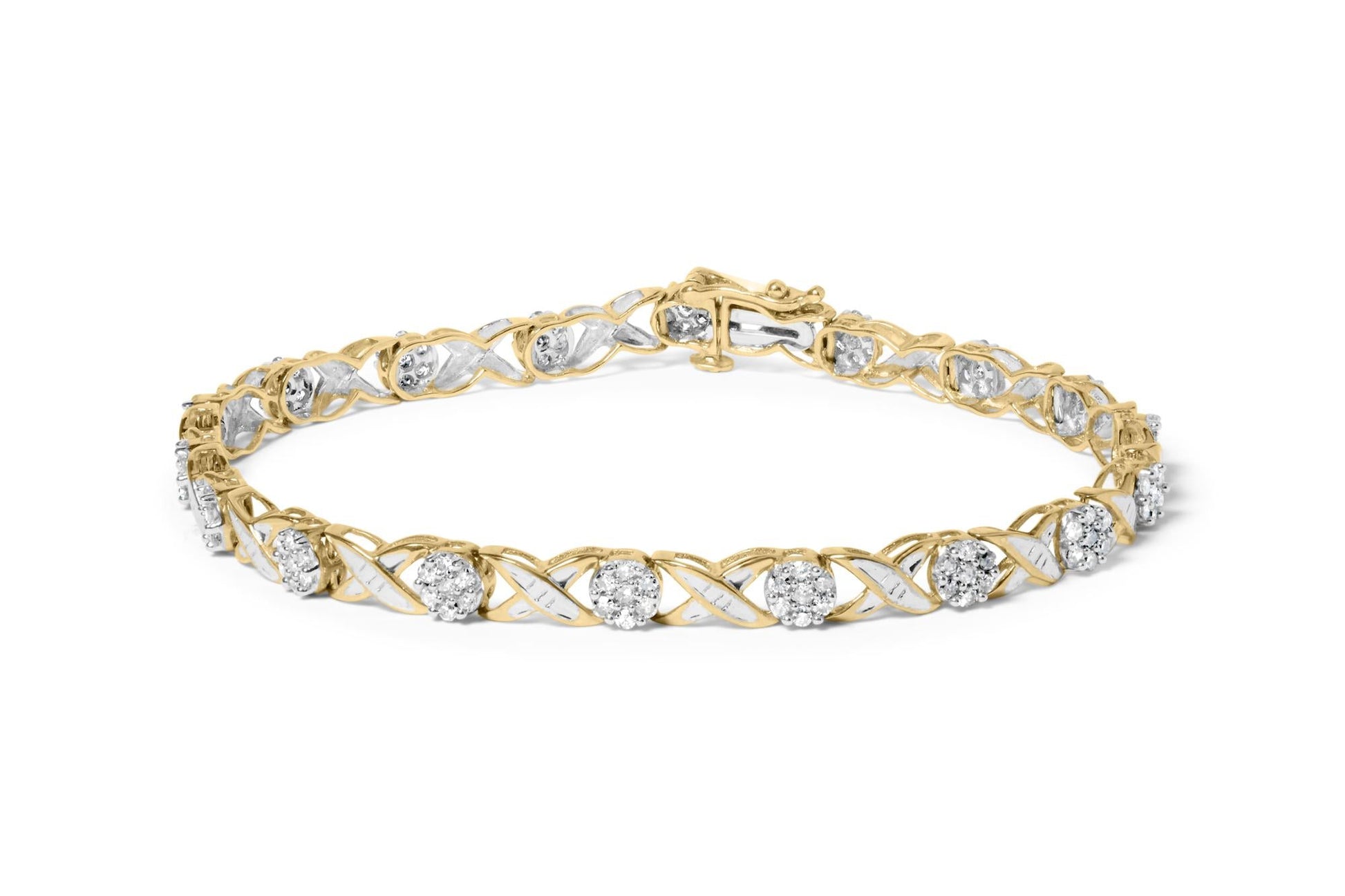 Indulge in the exquisite beauty of this 10K Yellow Gold Diamond Floral X-Link Bracelet. Crafted with utmost precision, this bracelet features a mesmerizing arrangement of 126 natural round-cut diamonds, totaling 1.00 cttw. The dazzling diamonds, with their I-J color and I2-I3 clarity, are meticulously set in a pave style, creating a stunning floral pattern. The 7" bracelet is designed to grace the wrist of a sophisticated woman, adding a touch of elegance and grace to any ensemble. With its box clasp, this bracelet ensures a secure and comfortable fit. Elevate your style and embrace the brilliance of diamonds with this captivating piece.