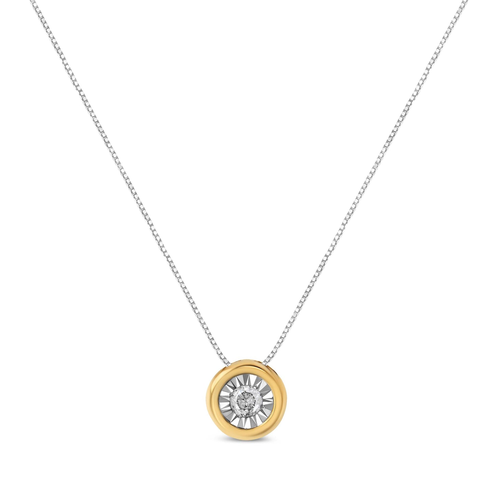 A classic piece with a bright and modern twist, this solitaire necklace is created in the finest 10k yellow gold. A single round-cut diamond sits at the center of this pendant in a miracle setting. This diamond accent bezel necklace comes with an 18" box chain. It will hang beautifully on your neck and add a touch of glamour to your everyday outfit.