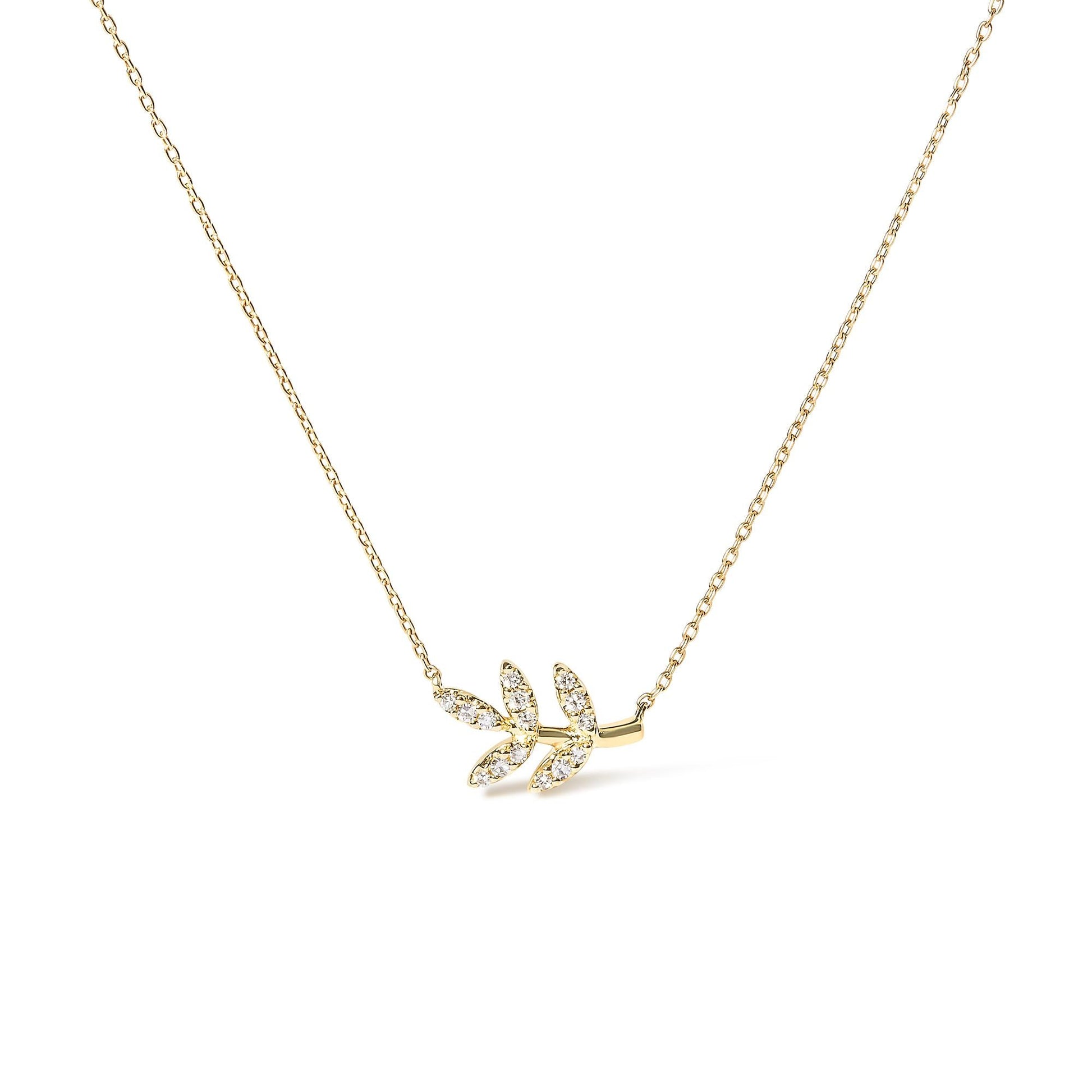 Introducing a mesmerizing masterpiece that will leave you captivated. Crafted in 10K yellow gold, this enchanting pendant necklace features a stunning leaf and branch design, symbolizing growth and harmony. Adorned with 15 round diamonds, totaling 1/10 cttw, the brilliance of these precious stones beautifully complements the warm glow of the gold. The pave setting ensures that each diamond is securely nestled, creating an exquisite display of sparkle. With a spring ring clasp, this necklace effortlessly graces your neckline with elegance and sophistication. Perfect for women who appreciate nature's beauty and desire a touch of luxury, this pendant necklace is a true treasure that will enhance any outfit. Embrace the allure of nature and indulge in the timeless charm of diamonds with this extraordinary piece.