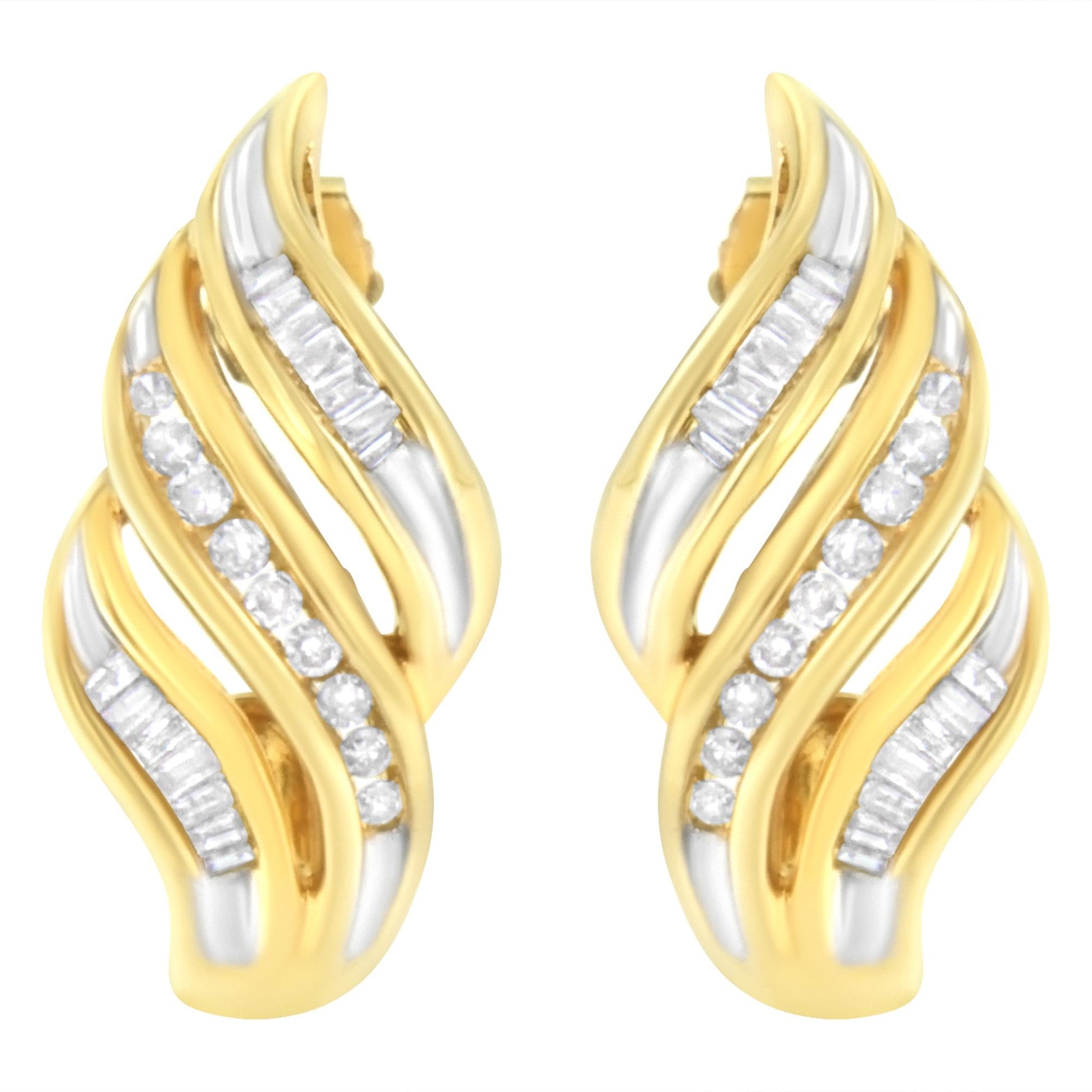 Crafted in 10k yellow gold, these earrings have a striking design. 3 separate ribbons of yellow gold delicately flow to create soft curves that meet at the bottom of the design creating an spiral effect. Each ribbon is inlaid by a row of channel set diamonds. 1/2 a ct TDW of round and baguette cut diamonds sparkle in this design.