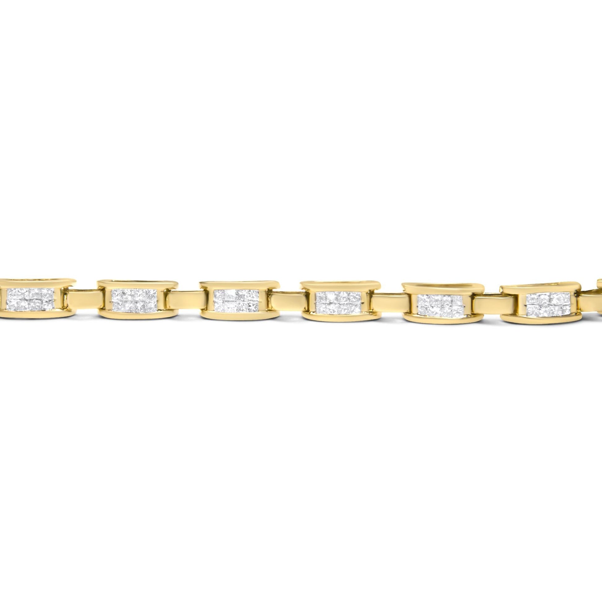 Slip into timeless luxury when you don this glamorously stunning diamond link bracelet. This classic bracelet takes on an enduring design that sparkles with a total 2 cttw princess-cut diamonds of an approximate I-J color and SI2-I1 clarity. The genuine 10k yellow gold assures the bracelet will stay tarnish free for years to come. The well defined rectangular contour of this piece lends a beautiful silhouette with the diamonds featured in an invisible setting that perfectly showcases the sparkling diamonds and the precious metal. This bracelet fastens via a box clasp. It is 7 inches long, best for small and medium sized wrists.