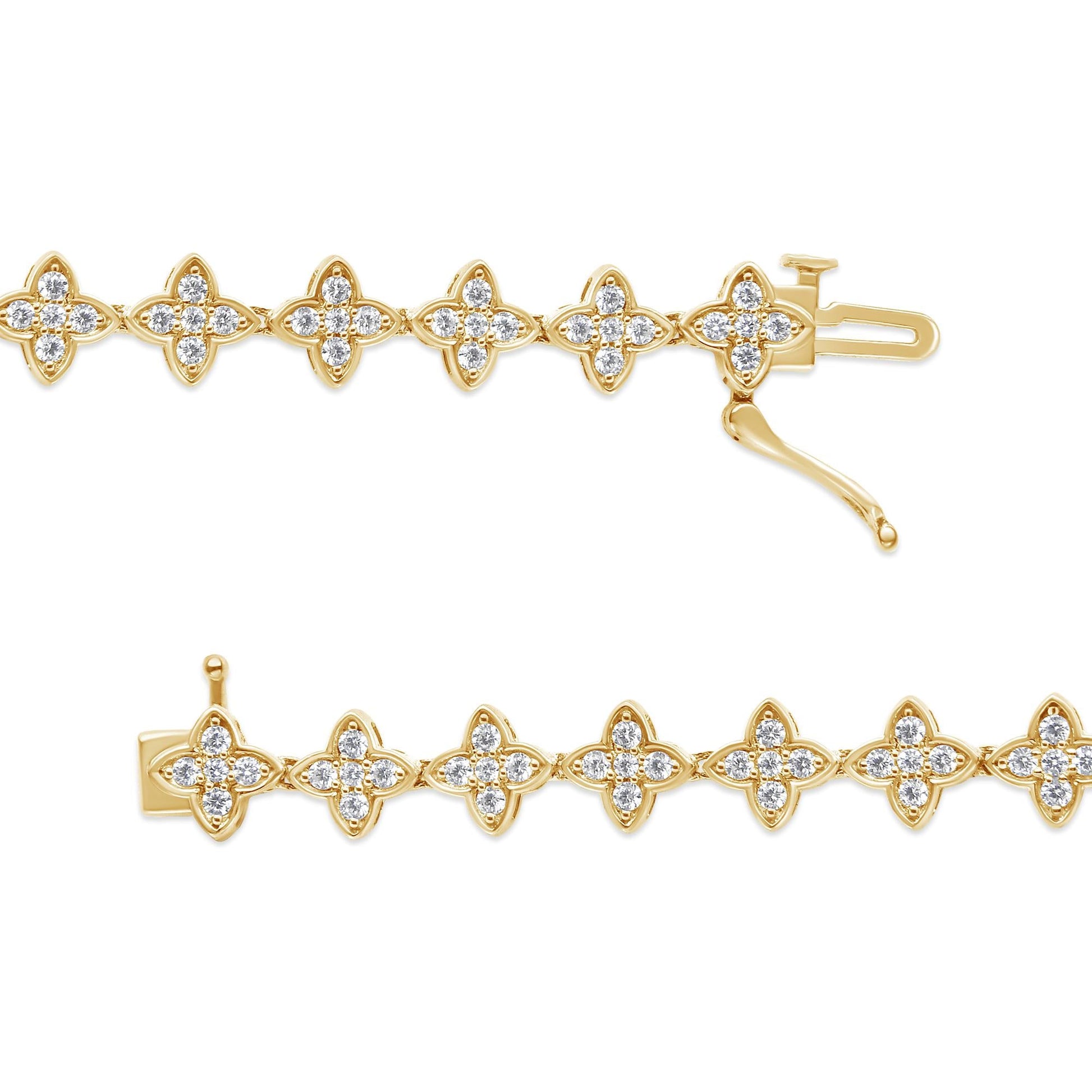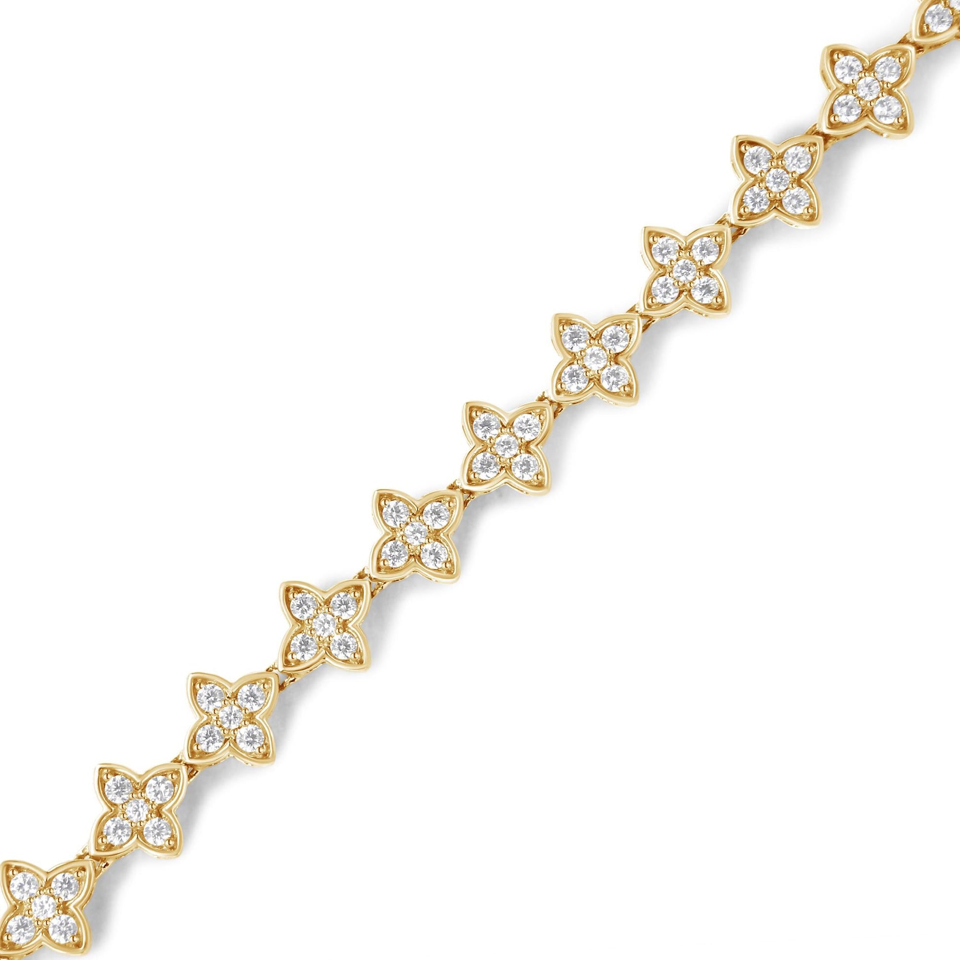 You will love this nature inspired link bracelet. Each flower link is inlaid with 5 glimmering round cut diamonds. This bracelet holds 2ct TDW of diamonds and is crafted in 10k yellow gold. A box with clasp mechanism keeps the bracelet secure and you worry free.