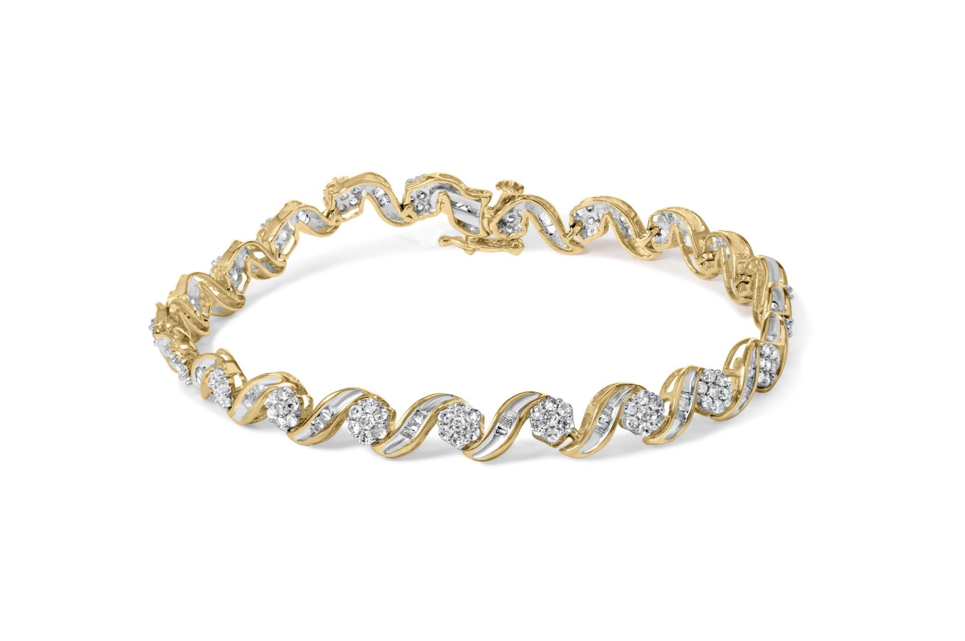 10K Yellow Gold 2.00 Cttw Round-Cut and Baguette-Cut Diamond Floral Design Swirl Link 7" Bracelet (I-J Color, I1-I2 Clarity)