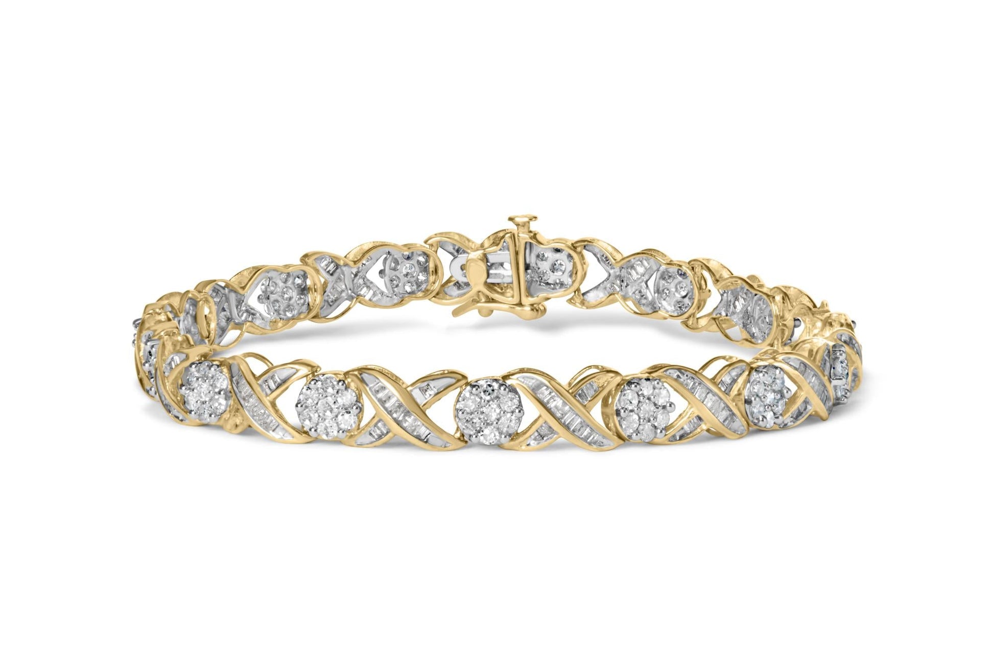 10K Yellow Gold 3.00 Cttw Round-Cut and Baguette-Cut Diamond 'XOXO' Floral Design 7.50" Bracelet (J-K Color, I1-I2 Clarity)