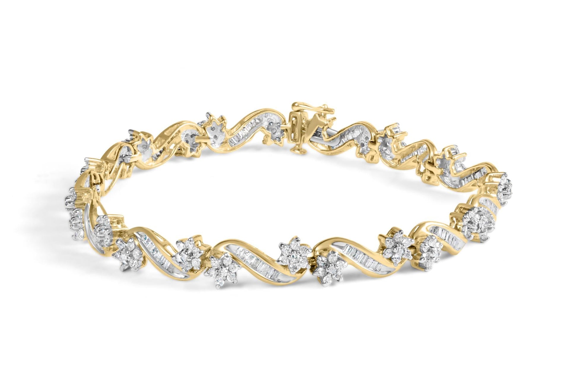 10k Yellow Gold 3.00 Cttw Round-Cut and Baguette-Cut Floral Link 7.25" Bracelet (I-J Color, I1-I2 Clarity)
