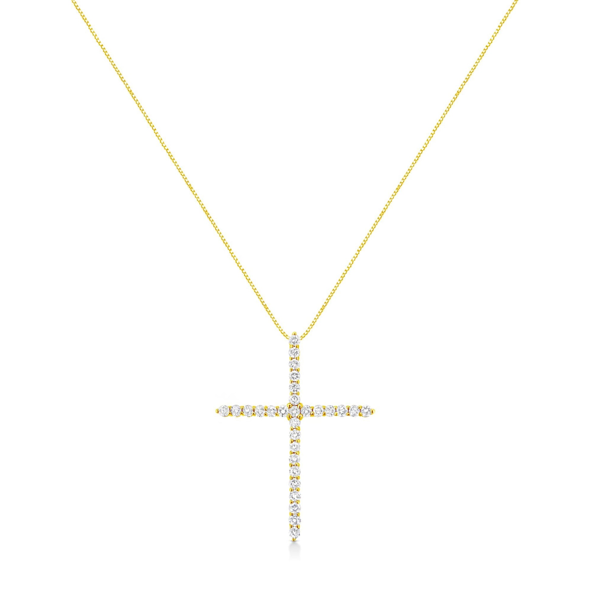 This glamorous cross pendant is embellished with a stunning total carat weight of 3 cttw. Beautiful and natural round-cut diamonds glimmer in this necklace and are set in the finest 10k yellow gold that will shine on your necklace. This piece will dress up any outfit of yours, and will become your most valued accessory.