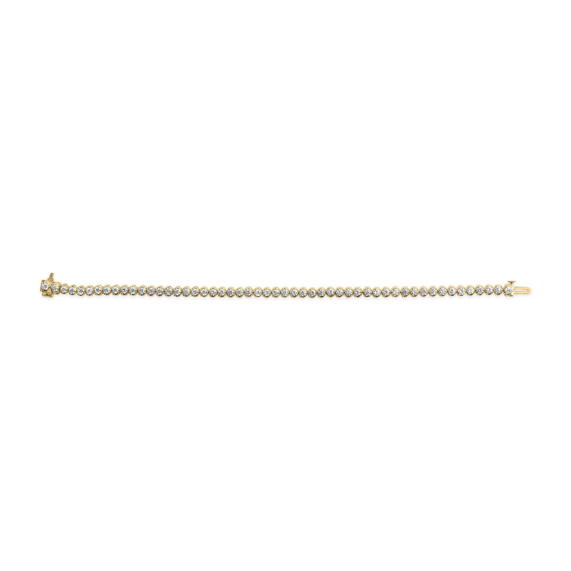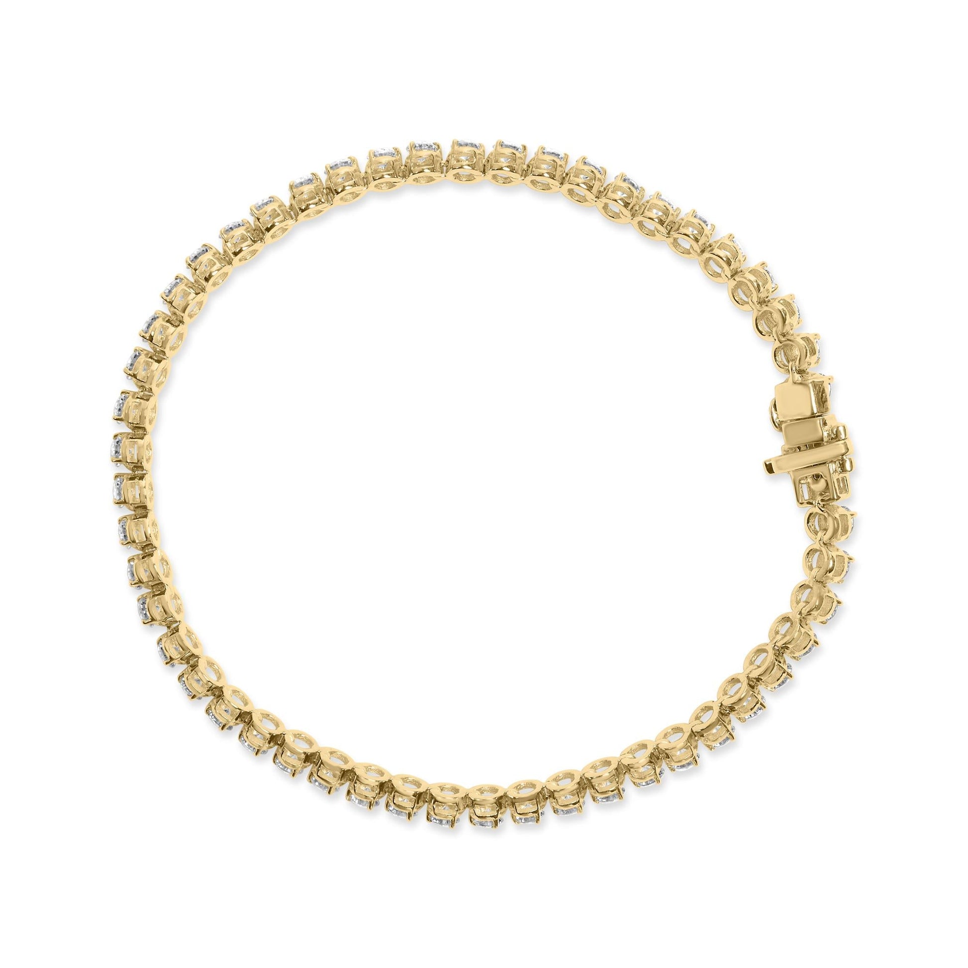 Exquisite in craftsmanship and radiant in design, this bracelet revives the timeless elegance of the tennis style imbued with modern grandeur. Crafted from lustrous 10K yellow gold, the bracelet is bejeweled with a dazzling array of natural, earth-mined diamonds, collectively weighing 4.0 carats. Each diamond is meticulously held in place by a three-prong setting, showcasing a splendid J-K color and I1-I2 clarity that glimmers with every flicker of light. At 7.25 inches, it clings gracefully to the wrist, secured by a robust box clasp with a safety latch, promising both comfort and opulence. This piece not only adorns your ensemble but elevates it, making it a perfect heirloom that captures the essence of both luxury and emotional depth.