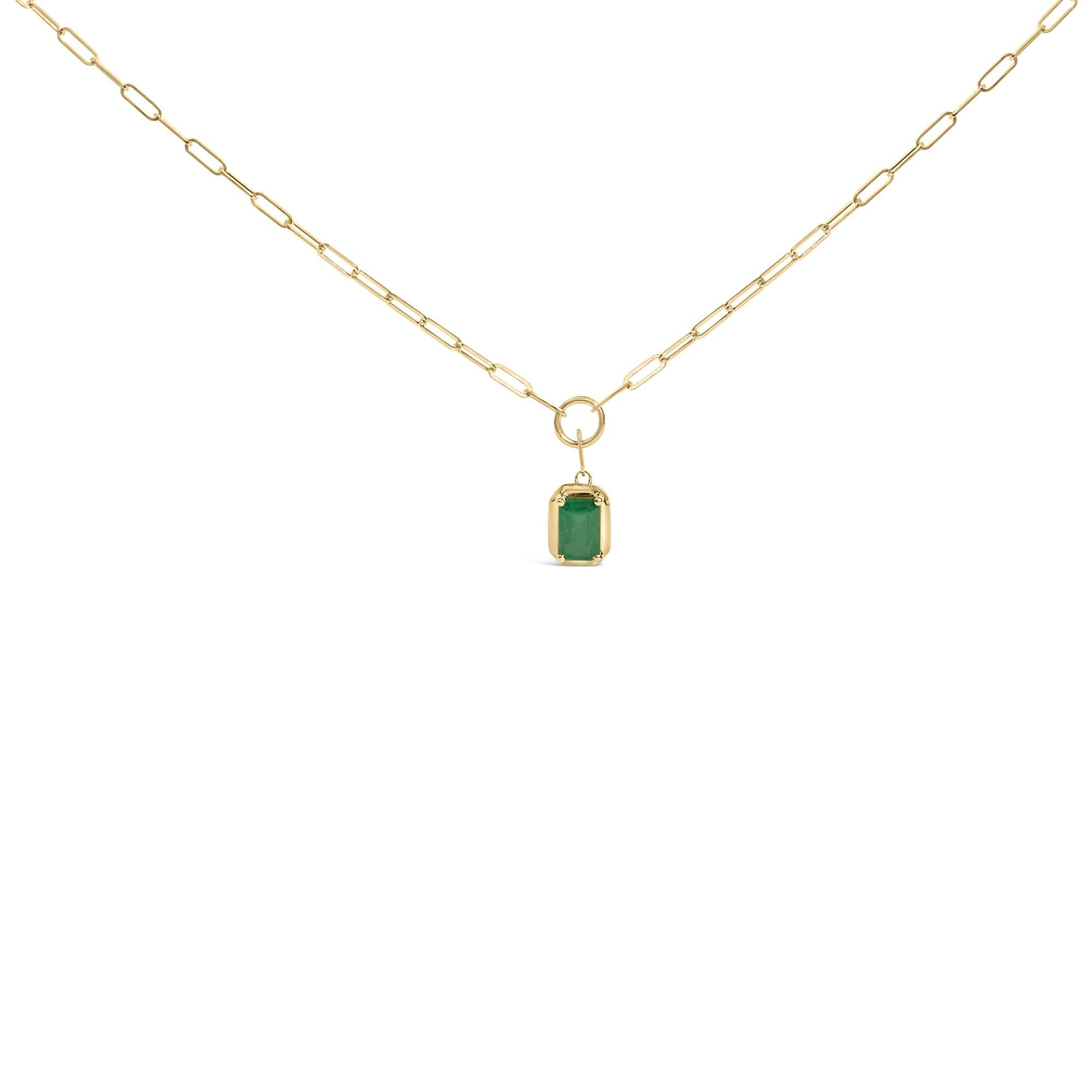 Envelop your neckline in the timeless elegance of our solitaire pendant necklace, an exquisite synthesis of classic sophistication and modern grace. Crafted with meticulous care from radiant 10K yellow gold, it features a natural, oiled green emerald, cherished for its vivid, deep greens and expertly cut into an alluring emerald shape. Measuring 6x4 mm, this gemstone is cradled securely by four delicate prongs that enhance its luminous allure. Suspended from a sleek 18-inch paperclip chain that catches the light with every movement, this pendant secures with a sturdy lobster claw clasp, promising both safety and comfort. This piece is not merely a testament to artistic craftsmanship but a portal to a lifestyle of understated luxury, inviting you to carry the spirit of refinement with you in every moment.
