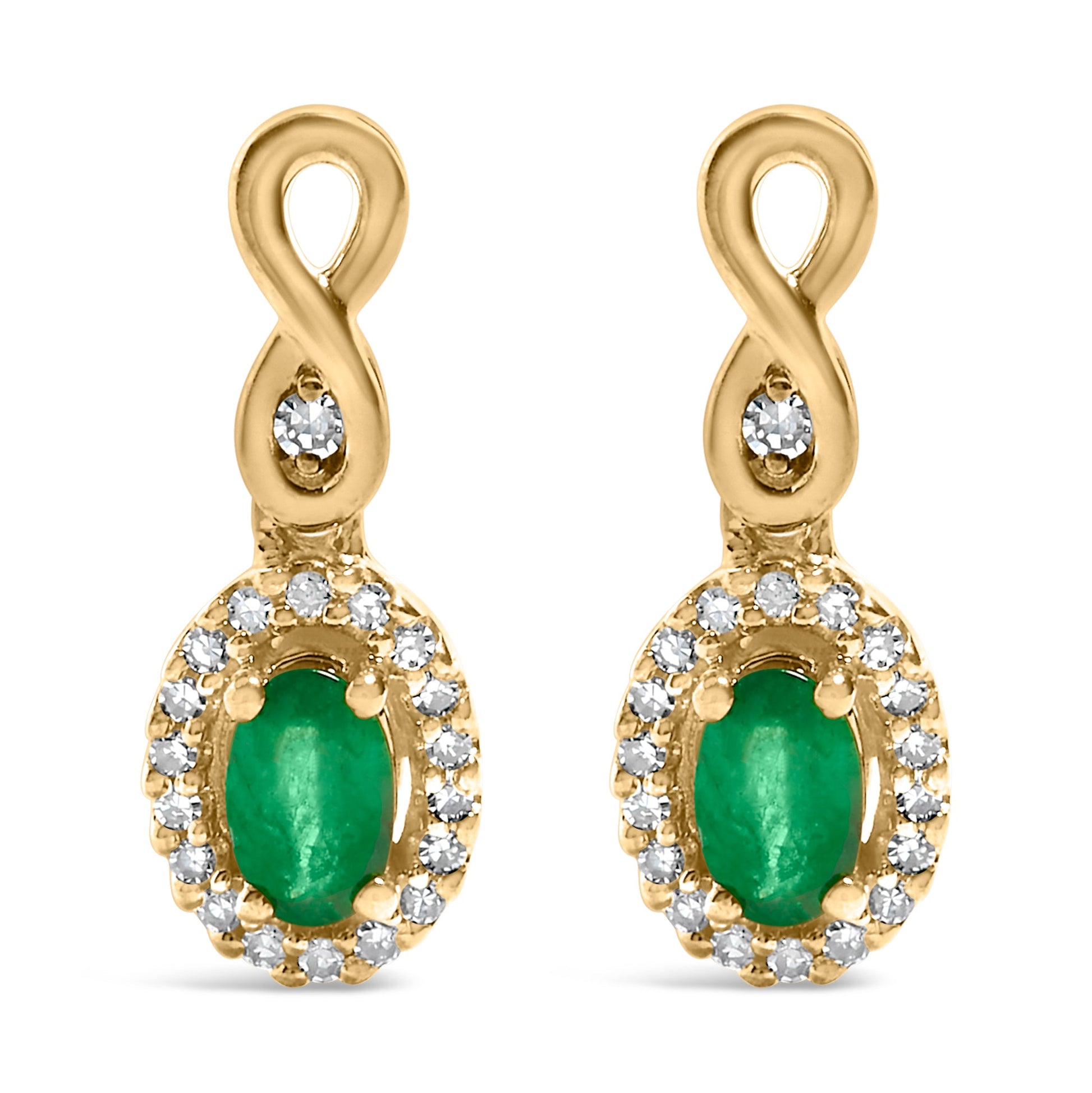Immerse yourself in the opulent shimmer of these 10K yellow gold earrings, where each graceful dangle cradles a lush, oval-cut green emerald, naturally sourced and delicately oiled to deepen its verdant allure. Measuring an impeccable 5x3 mm, the emeralds are encircled by halos of glinting natural diamonds, summing up to a sparkling 1/7 cttw. Crafted with artistry, the gold loops above each gemstone feature intricate accents of tiny diamonds, adding a touch of dazzle and sophistication. These earrings dance with each movement, catching light and casting envious glances, perfect for elegant evenings or as cherished gifts that promise to evoke passion and admiration.