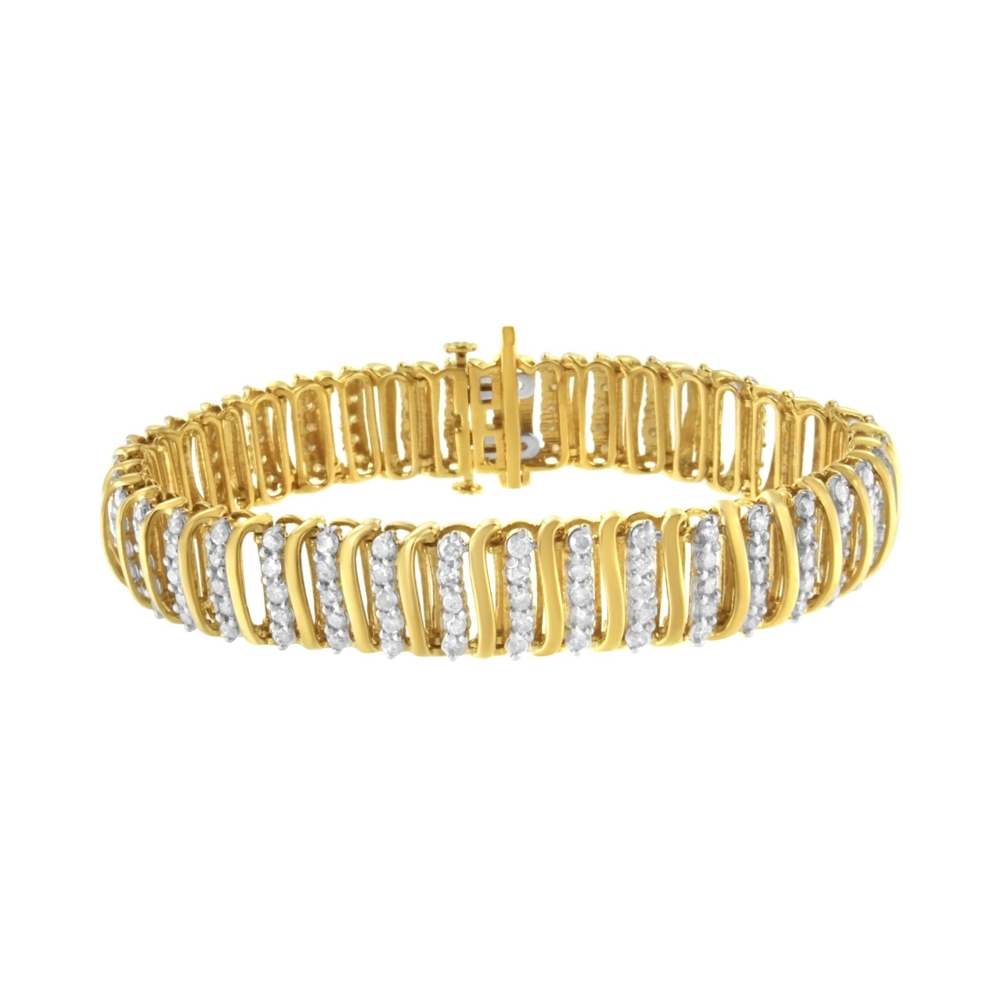 Elegant and timeless, this luxe tennis bracelet boasts an impressive 5.0 carat total weight of round cut diamonds. It features S shaped waves of 10K yellow gold plated sterling silver alternated with waved columns of 5 diamonds in shared prong settings. The bracelet has a secure double box catch with safety. This authentic design is crafted of real 92.5% sterling silver that has been electro-coated with genuine 10K yellow gold, a precious metal that will keep a tarnish-free shine for years to come. This sweet serpentine tennis bracelet makes a perfect gift for any occasion and especially for a formal night out! It's a classic and feminine piece she'll want to show off every day.