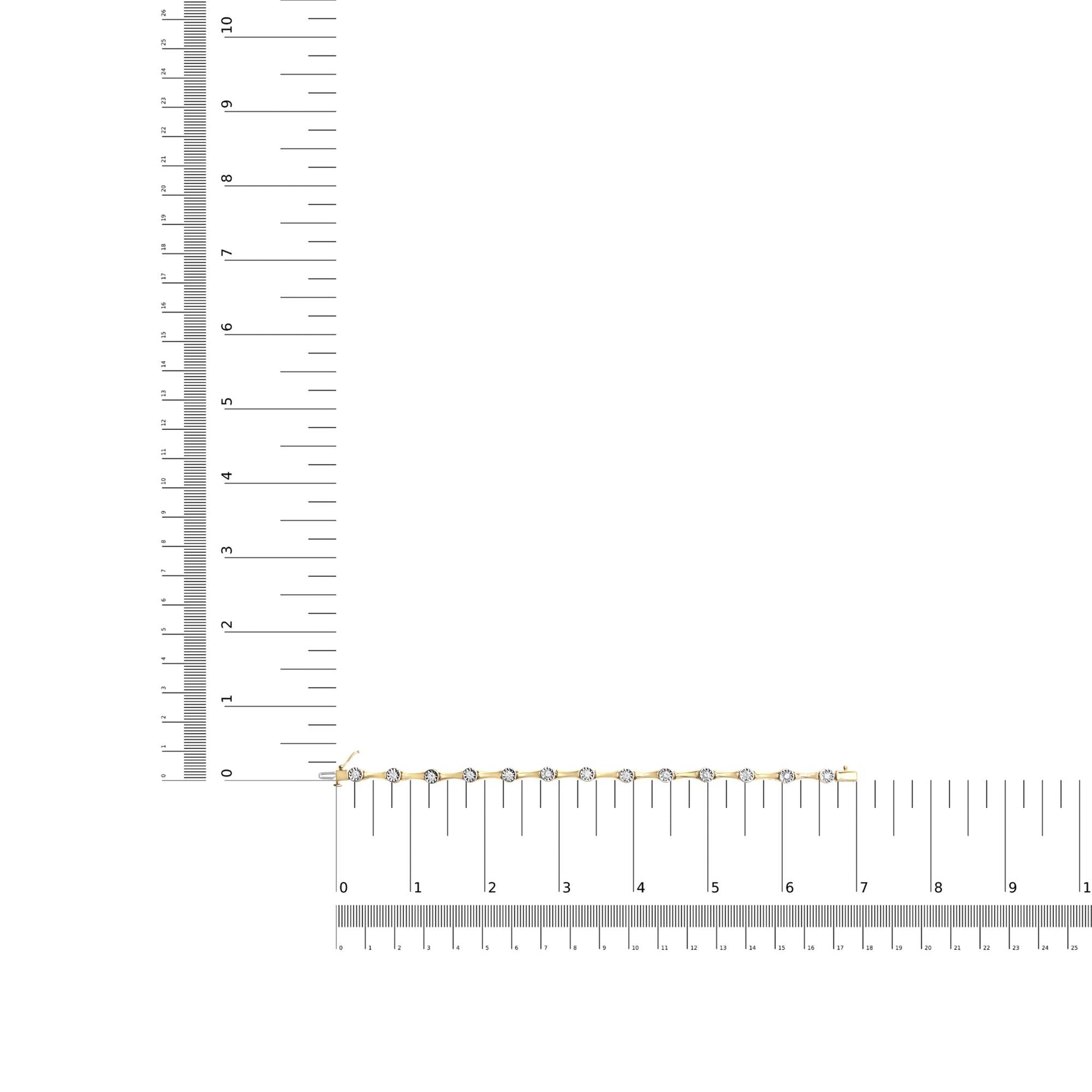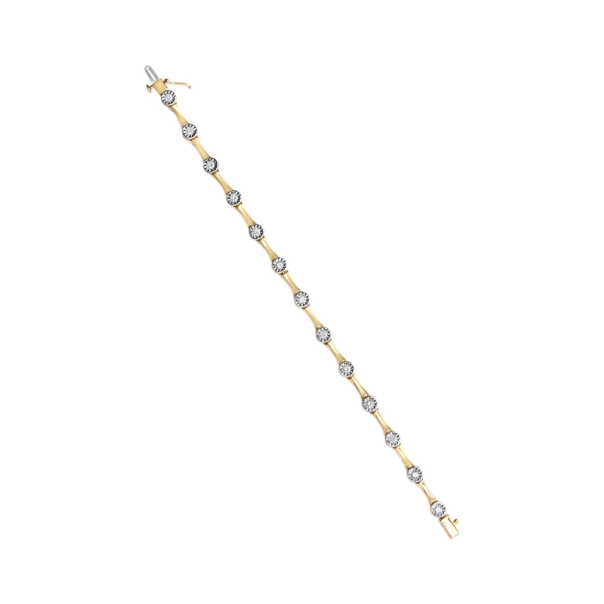 Adorn your wrist with the dazzling sparkle of diamonds. Crafted with care and precision, this bracelet is a true treasure. Plated with 10K yellow gold, the .925 sterling silver base shines with a warm, radiant glow. The round cut diamonds, with a total weight of 1.0 carats, are set in a miracle style that showcases their brilliance from every angle. With a beautiful H-I color and I3 clarity, these diamonds are sure to catch the eye and make a lasting impression. The bezel style setting provides extra protection for the diamonds, ensuring they will stay secure for years to come. The box with clasp closure provides a secure fit on your wrist and the 7 inch length is perfect for everyday wear. Upgrade your jewelry collection with this stunning miracle station bracelet and add a touch of luxury to any outfit.