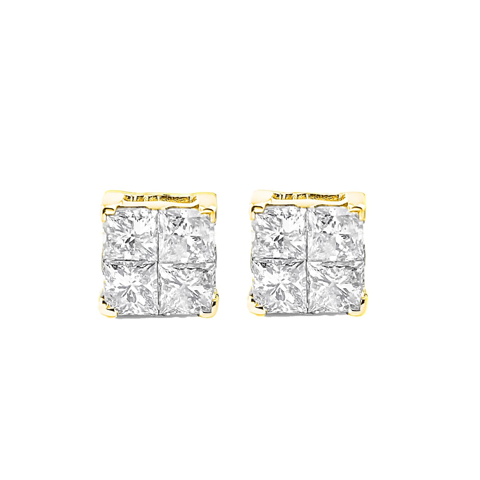 These classic and beautiful stud earrings feature 1ct TDW of stunning, natural princess-cut diamonds. Four princess-cut diamonds in an invisible setting create a larger stone that captures the light in a unique way. These earrings are created in 10k yellow gold plated sterling silver and secure with a push back mechanism. The silver is the finest .925 sterling silver, plated with rhodium (a platinum-family metal) for a lifetime of tarnish-free wear. You will love how these earrings glam up any outfit you put on!