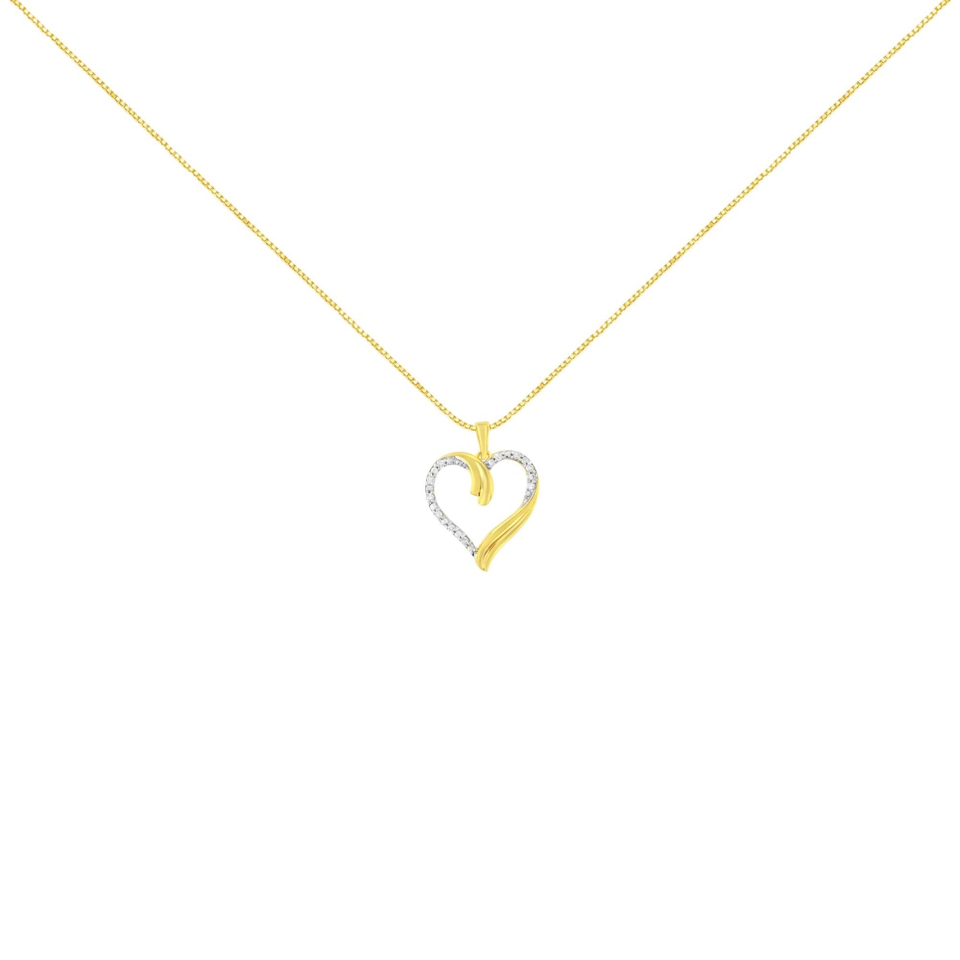 Fashioned in 10k yellow gold plated sterling silver, this looping ribbon open heart pendant is adorned with sparkling round cut diamonds. The 1/10ct TDW diamond pendant dangles from a box chain that secures with a spring ring clasp.