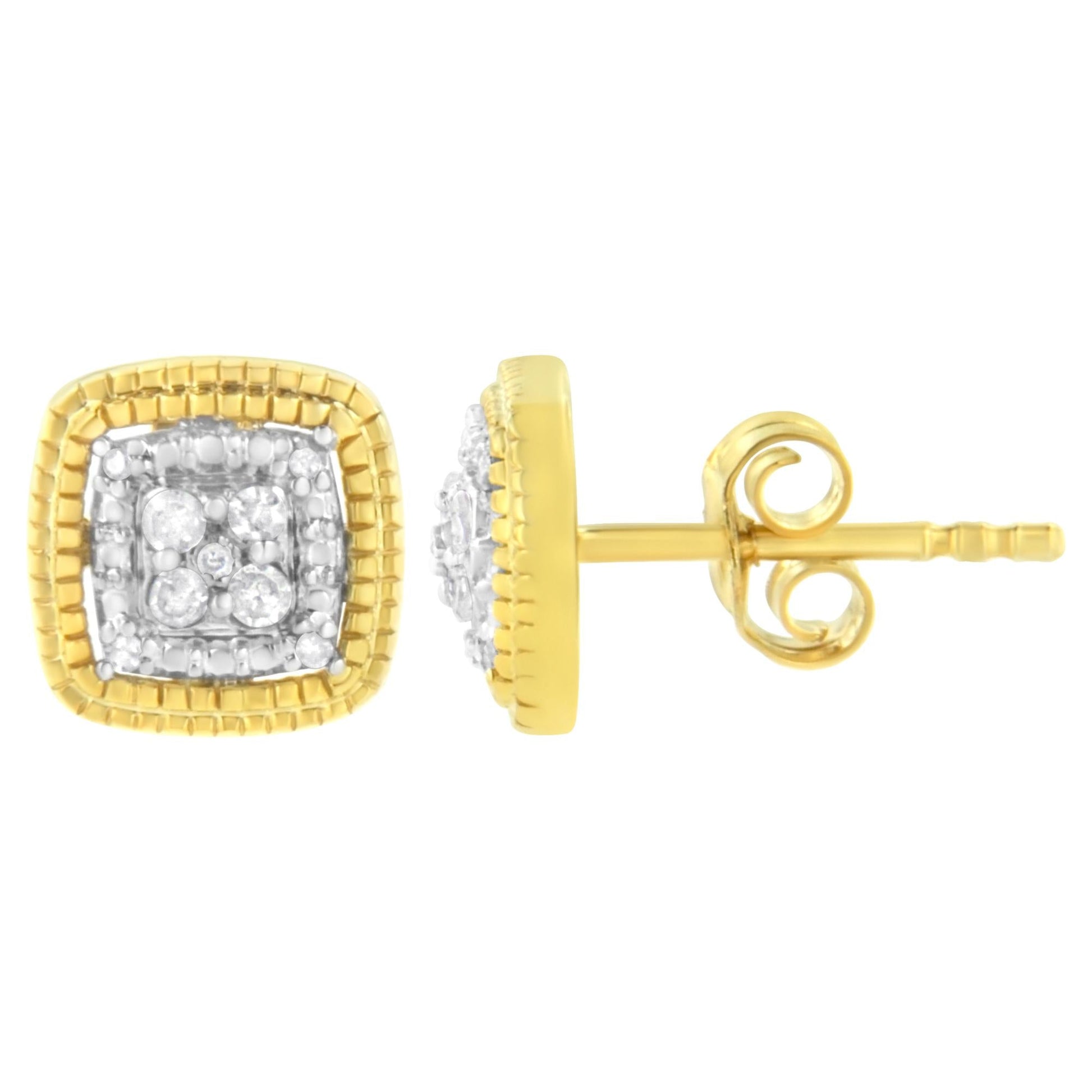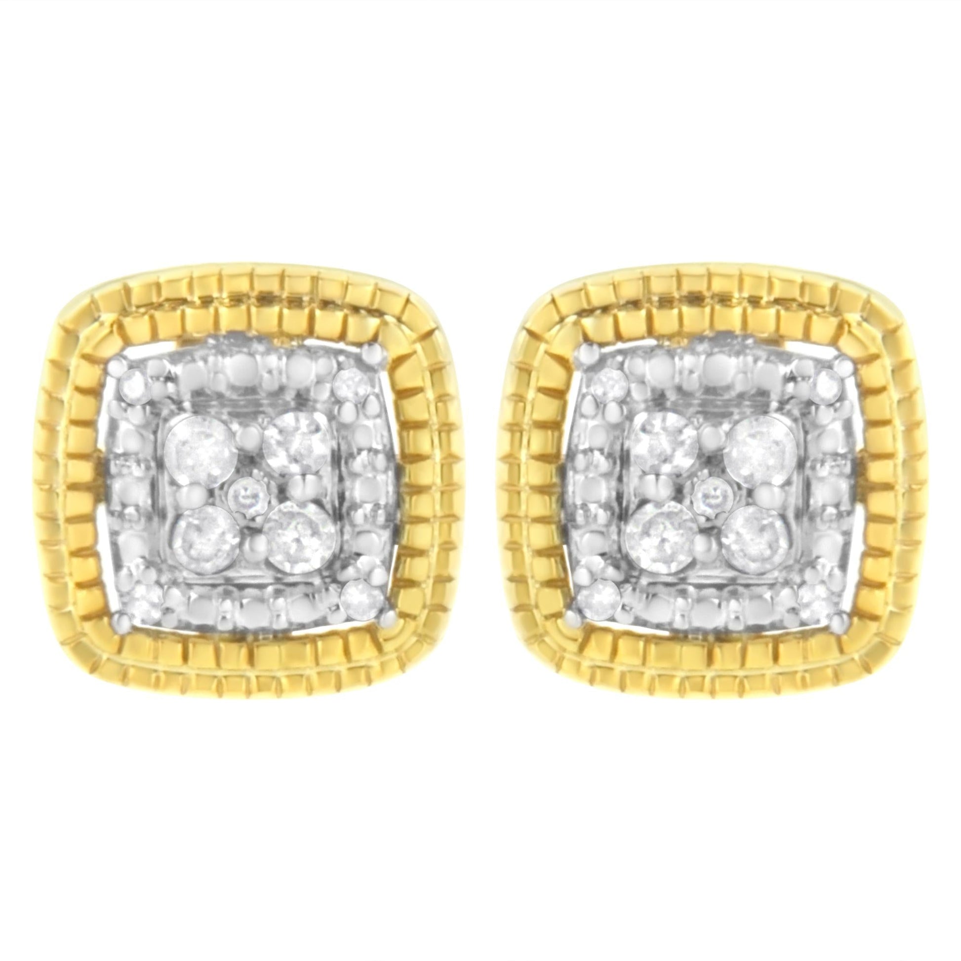 Held inside double yellow gold beaded floating halos a diamond design glitters. Round cut diamonds are set in a square shape and framed by a beaded silver ribbon that displays in each corner a round cut diamond accent. These 10k yellow gold plated and sterling silver stud earrings showcase 1/10ct TDW of diamonds and will be the perfect complement for any outfit.