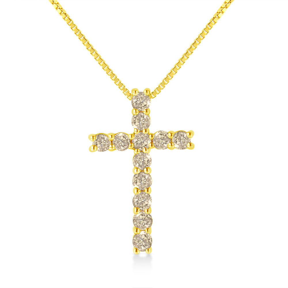 Embrace your inner spirituality with this timeless cross pendant crafted in genuine .925 sterling silver and plated with 10k yellow gold. This necklace is delicately embellished with round-cut diamonds in a classic prong setting. The deep brown, champagne diamonds add warm depth to your neckline. The cross has a total diamond weight of 1/2 c.t. and is the perfect accessory for everyday wear. The divine motif hangs off of an 18 inch cable chain that will rest beautifully on your neckline. This gold and diamond cross pendant will become a staple in your jewelry collection.