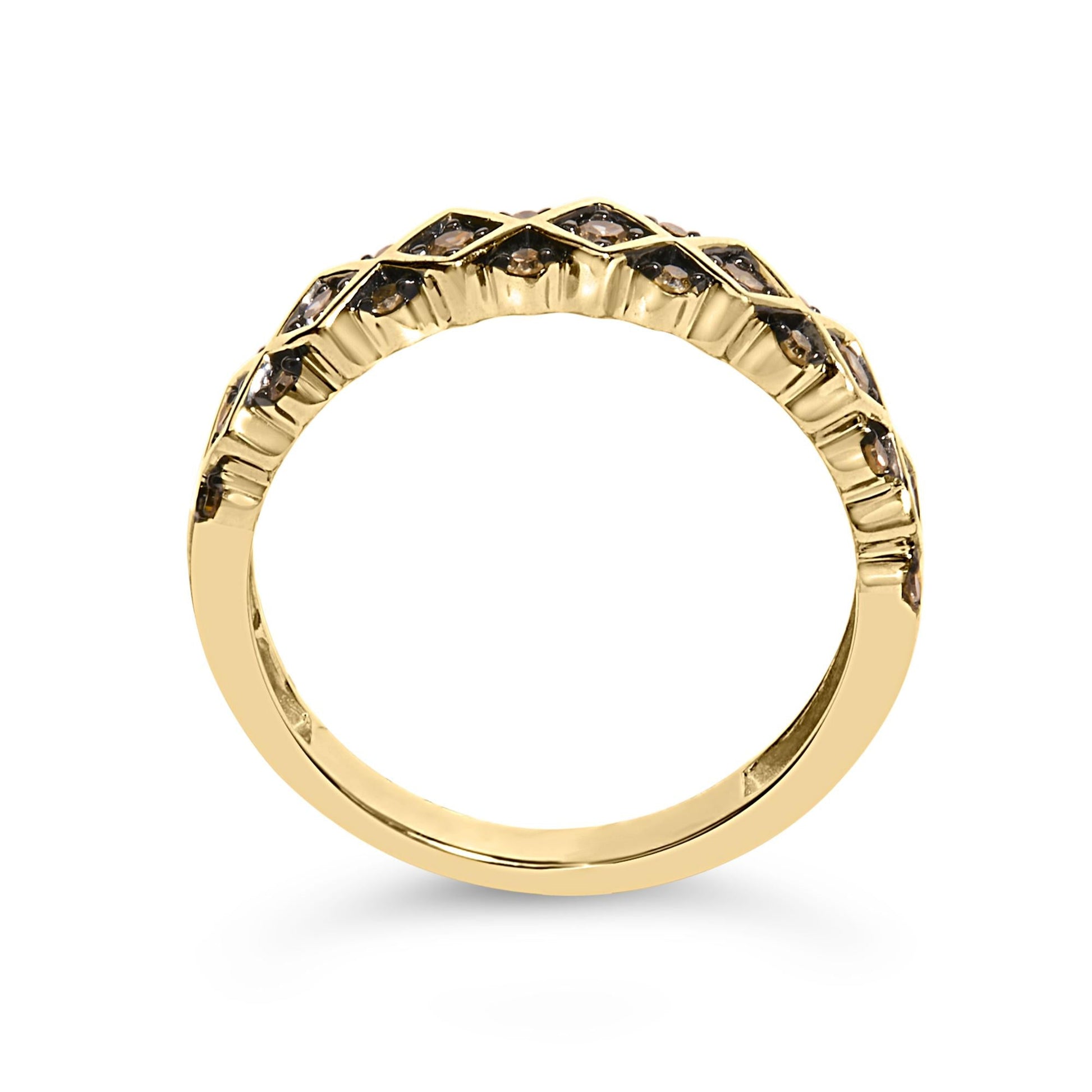 Wrap your finger in the opulent embrace of this exquisite band, masterfully crafted from .925 sterling silver and bathed in a sumptuous 10K yellow gold plating for a radiant glow. This ring unveils a captivating geometric pattern, each line and angle thoughtfully conceived to heighten its aesthetic allure. At its heart, the band treasures 1/4 carat of natural champagne diamonds, their enchanting brown hues intensified by a chic black rhodium finish, lending an extraordinary depth and sophistication that beguiles the beholder. Perfect for those who cherish elegance infused with a modern twist, this ring promises to be a timeless addition to any jewelry collection, elevating everyday moments to snippets of luxury.