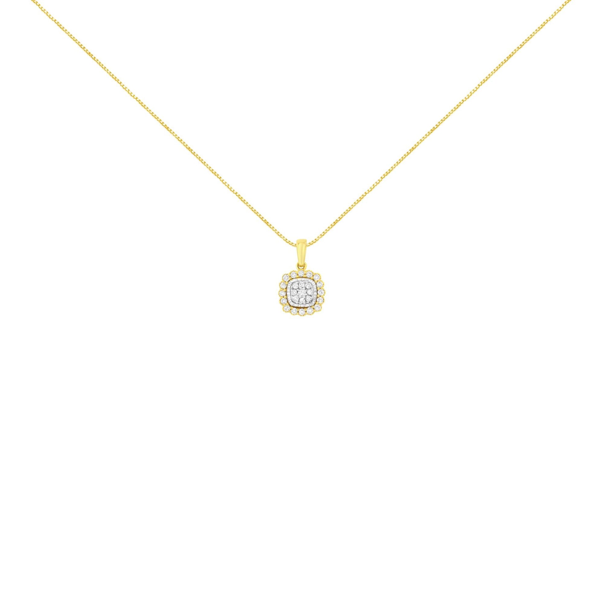 Minimalism is the latest fashion! Sparkle in the glory of stunning natural diamonds embedded in this .925 sterling silver necklace flash plated with 10K yellow gold. This 18" box chain with 25 round, prong set, natural diamonds in a square cushion shape is the perfect mix of luxury and class. It fastens securely with a spring ring clasp making it wearable for all your occasions. The I1-I2 Clear 0.25 ct diamonds makes you shine like a star. This is the type of pendant necklace you should gift your daughter on her birthday, sister on her graduation day, mother on Mother’s Day and wife on your anniversary. But don’t wait until then; buy it now because every day is a good occasion to gift this unique piece.