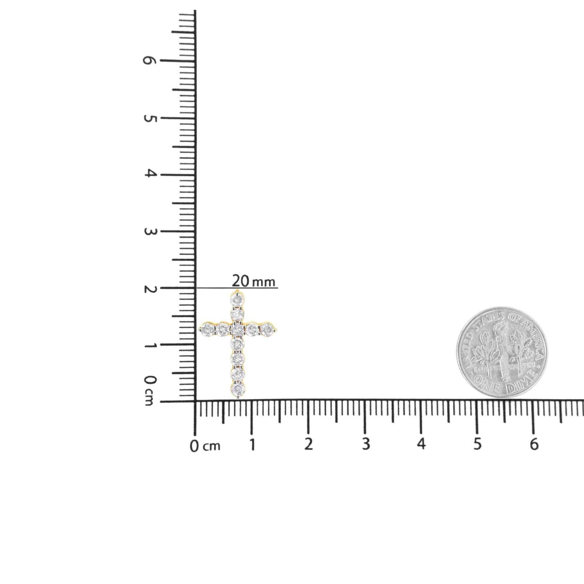 Faith meets fashion in this graceful diamond cross pendant. Crafted in warm 10k yellow gold plated .925 sterling silver, this feminine style crosses two single rows of shimmering prong-set diamonds to create an elegant design. Inspiring with 11 natural, sparkling diamonds weighing 1.00 ct. t.w. of diamonds and a brilliant buffed luster, this pendant suspends along an 18.0-inch box chain that secures with a spring-ring clasp.