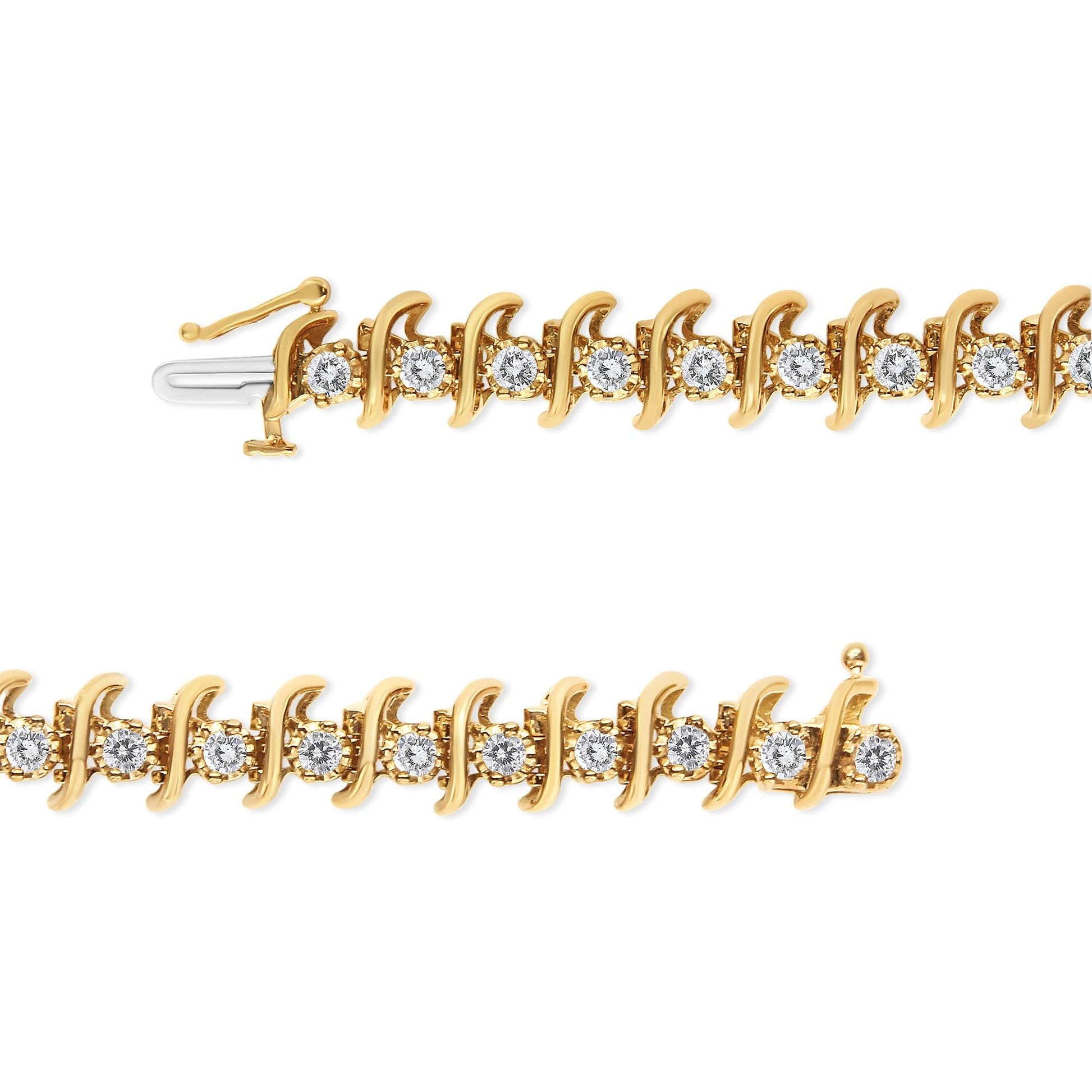 A lovely piece for a formal occasion, this 10k yellow gold plated .925 sterling silver bracelet will become your go-to for any event where you want to impress. This piece is uniquely designed with gold "S" links framing natural round-cut diamonds in a prong setting. With a total diamond weight of 3.00 cttw, this bracelet will add immense glamour to any outfit of your choice. It's fashioned with a box clasp for a secure and seamless fit. Sparkle on with this stunning piece resting on your wrist.