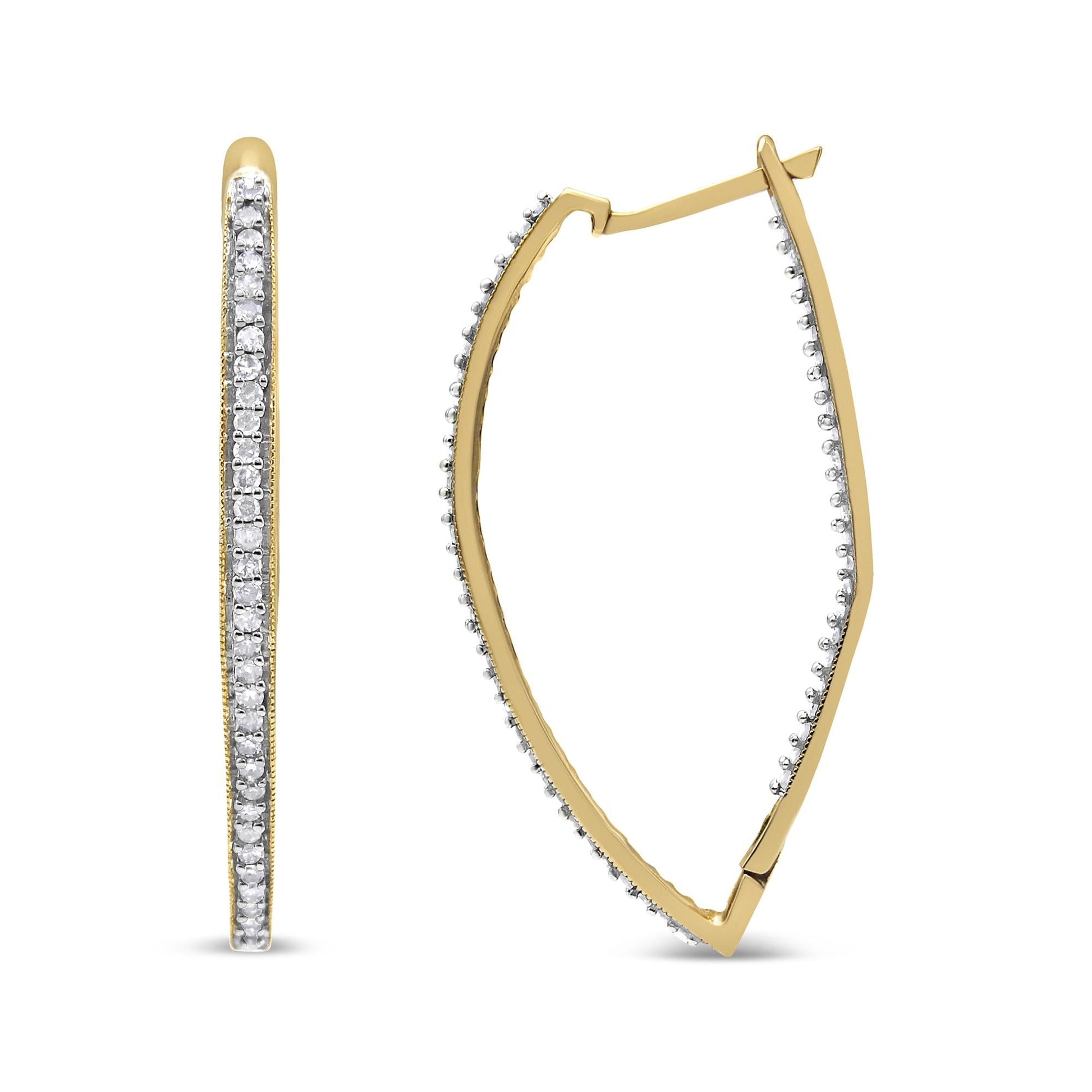 These glamorous 10k yellow gold hoop earrings showcase 1ct of round cut diamonds. The prong set diamonds inlay half the inside and outside of the hoops giving them maximum sparkle. These inside out hoop earrings are the perfect gift for that trendy, special someone in your life.
