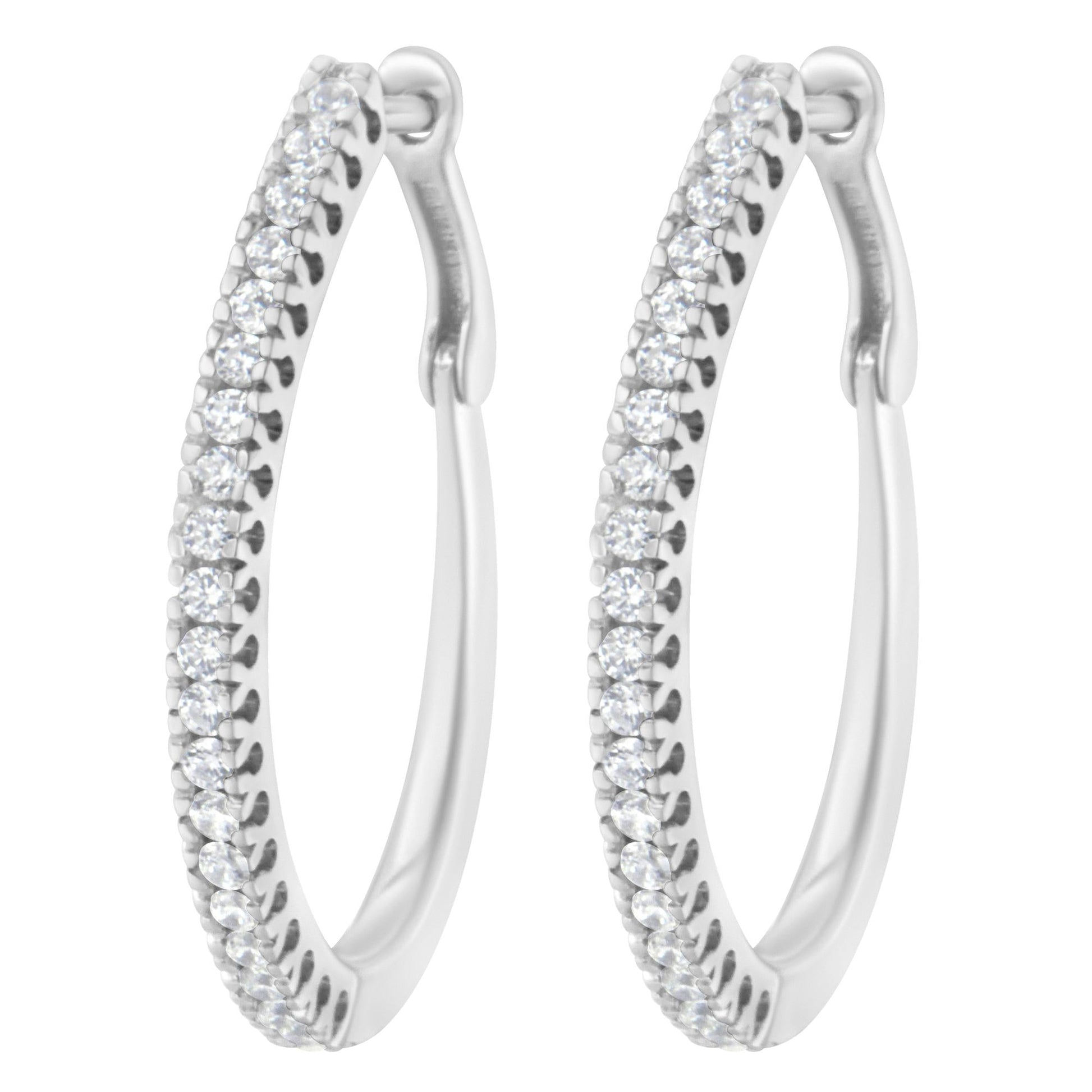 These glamorous 10k white gold hoop earrings showcase a 1/2ct of round cut diamonds. The prong set diamonds inlay half the outside of the hoops giving them maximum sparkle. These gorgeous hoop earrings are the perfect gift for that trendy, special someone in your life.
