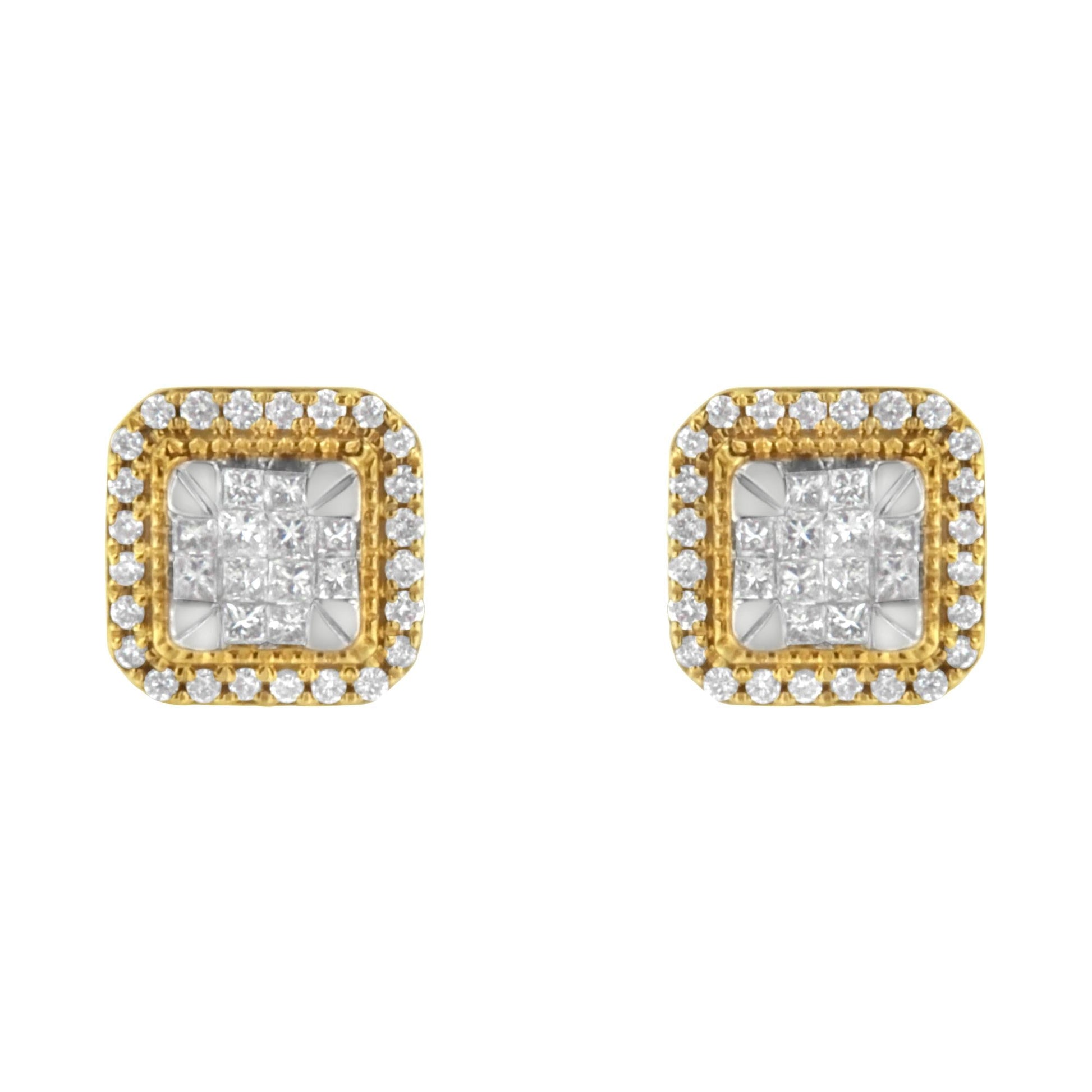 A pair of square diamond cluster stud earring that sparkle with a central cluster of princess cut diamonds surrounded by a halo of round diamonds. Milgrain beading adds a vintage touch to this unique design crafted in 10 karat yellow gold. They have a total diamond weight of 1/2 carat.