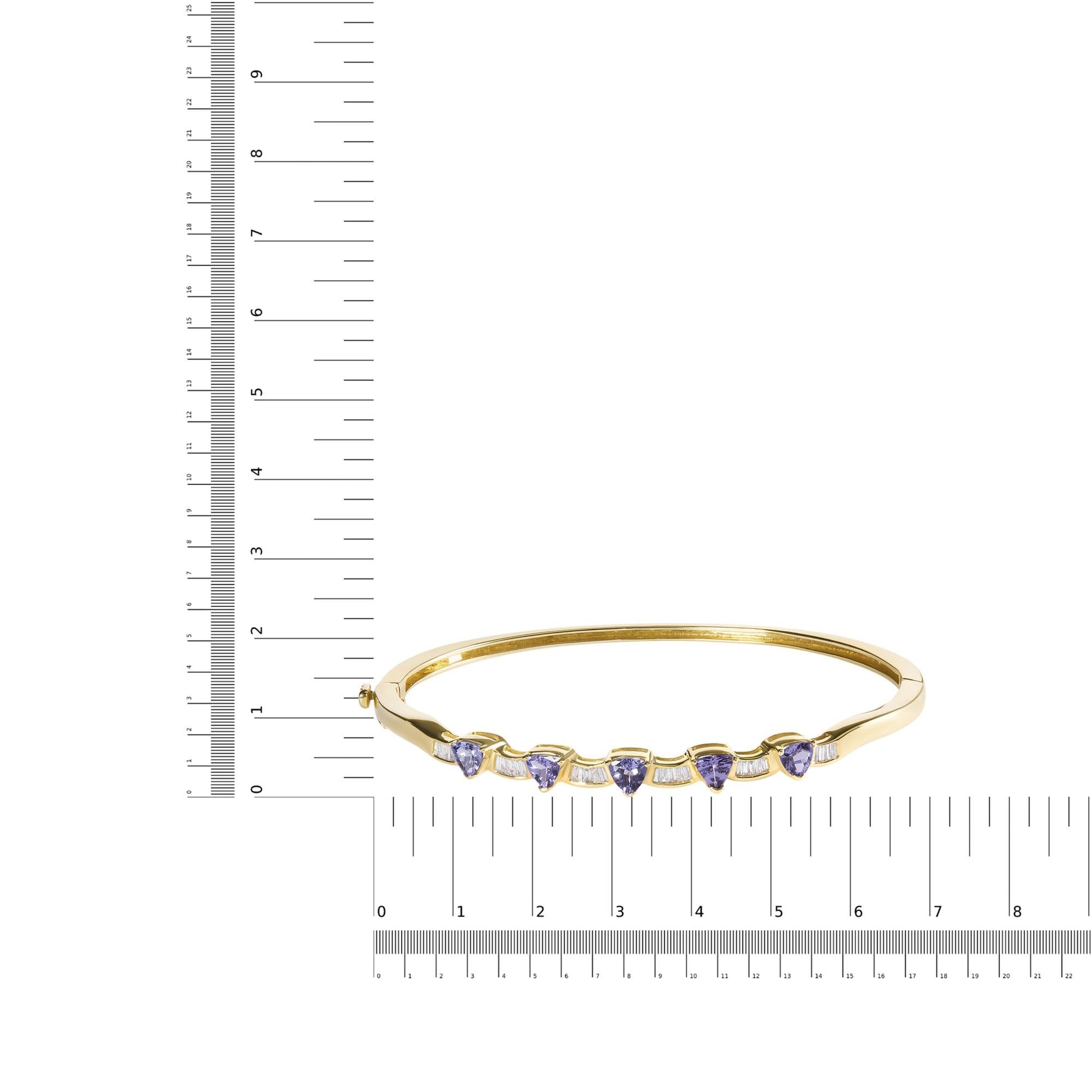 Immerse yourself in the exquisite elegance of this 14K white gold bangle, intricately crafted with alternating trillion tanzanites and baguette-cut diamonds. Each of the five pristinely color-treated tanzanites sparkles with a deep, enchanting blue, secured by three prongs that promise to catch the light and the eyes of passersby. Interspersed are diamonds that glimmer with an H-I color and VS2-SI1 clarity, totaling 1/3 carat to illuminate your every gesture. Designed to embrace wrists up to 7 inches, the bangle's precise fit is ensured by a reliable box clasp and safety latch, making it both a secure and mesmerizing addition to any ensemble. Whether for a sophisticated evening or a significant celebration, this bangle stands as a testament to impeccable taste and enduring style. 14K White gold is rhodium plated.