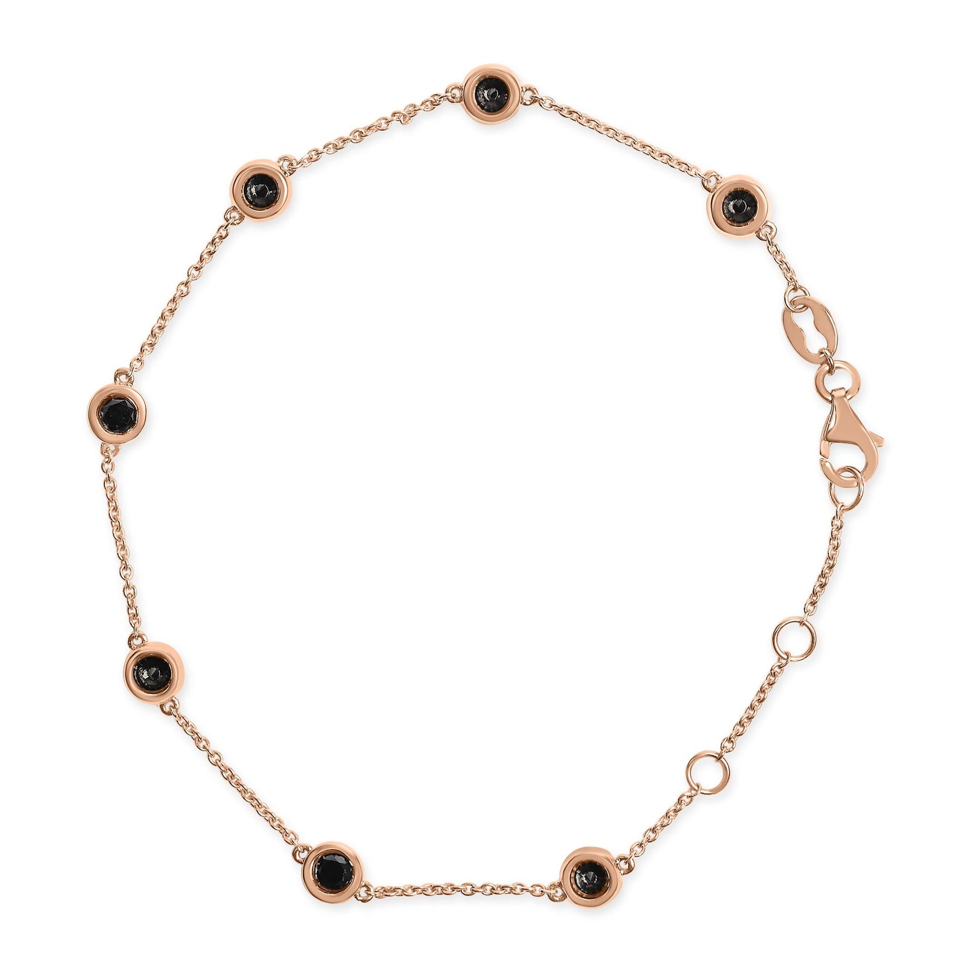 14K Rose Gold 1.00 Cttw Bezel Set Black Diamond 7 Station Link Bracelet (Black Color, I2-I3 Clarity) - 7.5" Inches