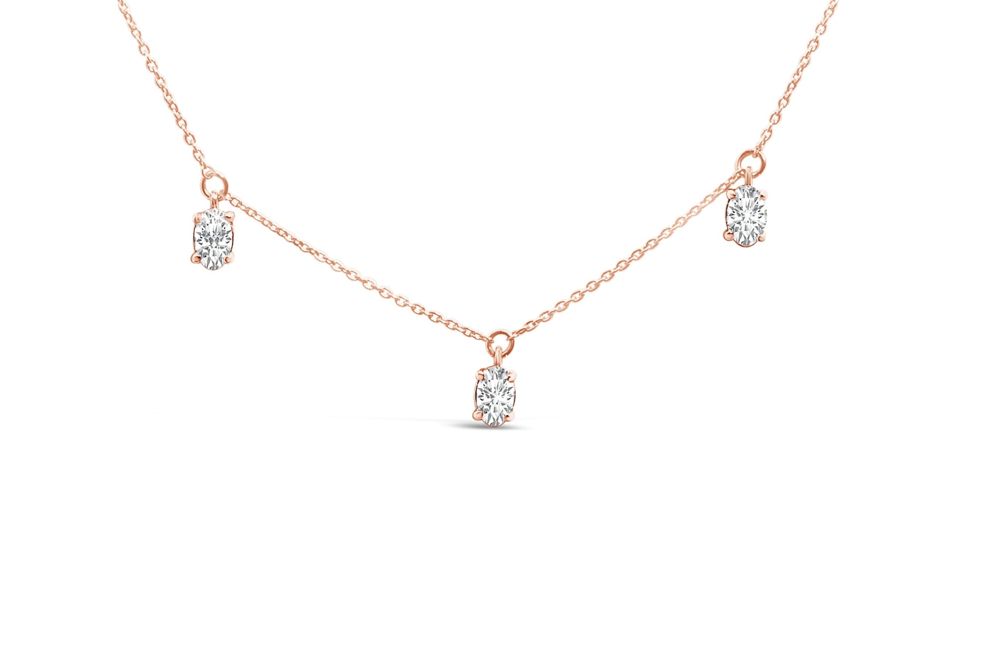 Draped in the warm, radiant embrace of 14K rose gold, this exquisite 17-inch necklace captivates the eye with the ethereal dance of seven lab-grown oval diamonds. Each gem, meticulously cradled in a quartet of prongs, twinkles with the promise of 1/5 carat, composing a harmonious symphony of 1 3/8 total carat weight. The artistry of the dangle stations conjures a ballet of light, offering an opulent yet understated allure. Secured with a spring ring clasp, this piece merges timeless elegance with contemporary craftsmanship, perfect for adorning life's most cherished moments. Embrace the future of fine jewelry with this lab-grown diamond creation, where modern sustainability meets classic luxury.
