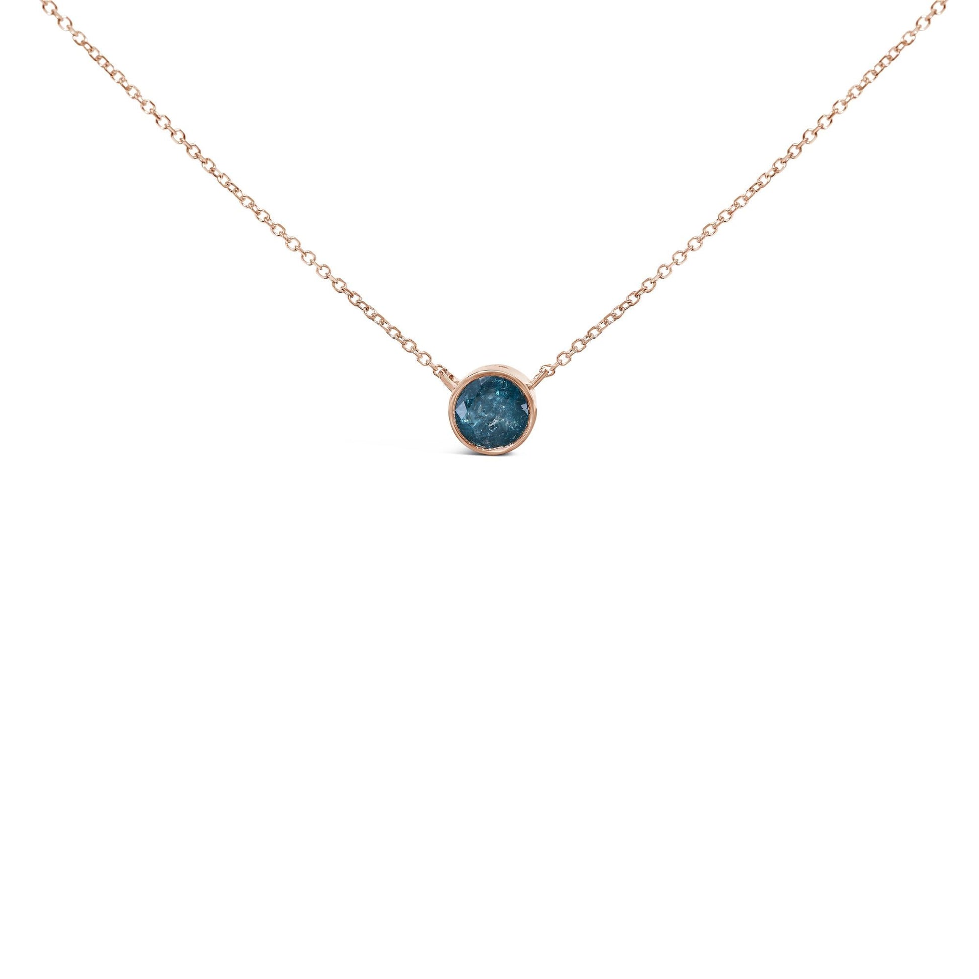 Immerse yourself in the allure of this exquisite necklace, where glamour meets sophisticated charm. At the heart of this piece is a mesmerizing 2.0 carat blue diamond, naturally sourced and expertly treated to accentuate its enchanting azure hue. Encased in a sleek bezel setting on an 18-inch cable chain, crafted from the finest 14K rose gold, this pendant exemplifies elegance with a modern twist. The secure spring clasp ensures that the necklace sits perfectly around your neck, adding a touch of luxury to any ensemble. Whether it's a gift for a loved one or a treat for yourself, this necklace is not just jewelry; it's a celebration of refined taste and timeless beauty.